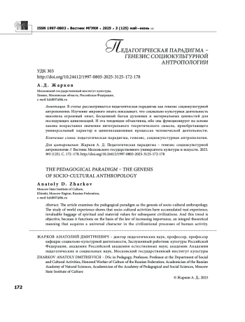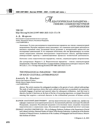 В статье рассматривается педагогическая парадигма как генезис социокультурной антропологии. Изучение мирового опыта показывает, что социально культурная деятельность накопила огромный опыт, бесценный багаж духовных и материальных ценностей для последующих цивилизаций. И эта тенденция объективна, ибо она функционирует на основе закона возрастания значения интегрального теоретического смысла, приобретающего универсальный характер в цивилизационных процессах человеческой деятельности.
