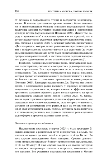 В работах, посвященных изучению радио, отмечается ряд важных характеристик, связанных с восприятием радиопередач взрослыми слушателями. Эти характеристики легли в основу нашего исследования. Так, слушание определяется как форма внимания, которая требует от воспринимающего сосредоточенности и нередко бывает связана с телесными практиками и манипуляциями [Эрлманн 2010]. Благодаря исследованию Дж. Портера мы можем судить о возможностях радио вызывать у взрослых слушателей «ощущение сопричастности», которое связано с эффектом одновременного слушания эфирного радио, когда в одно и то же время радиопередачу слушает много людей [Портер 2025, 5]. Опираясь на характеристики слушания радио как формы внимания, мы определили поле своего исследования, цель которого — выяснить, слушают ли современные дети радио, и если да, то как они узнают об этой возможности, каким образом слушание радио включено в их повседневную жизнь, как родители оценивают роль слушания радиоэфиров в процессе развития своих детей.