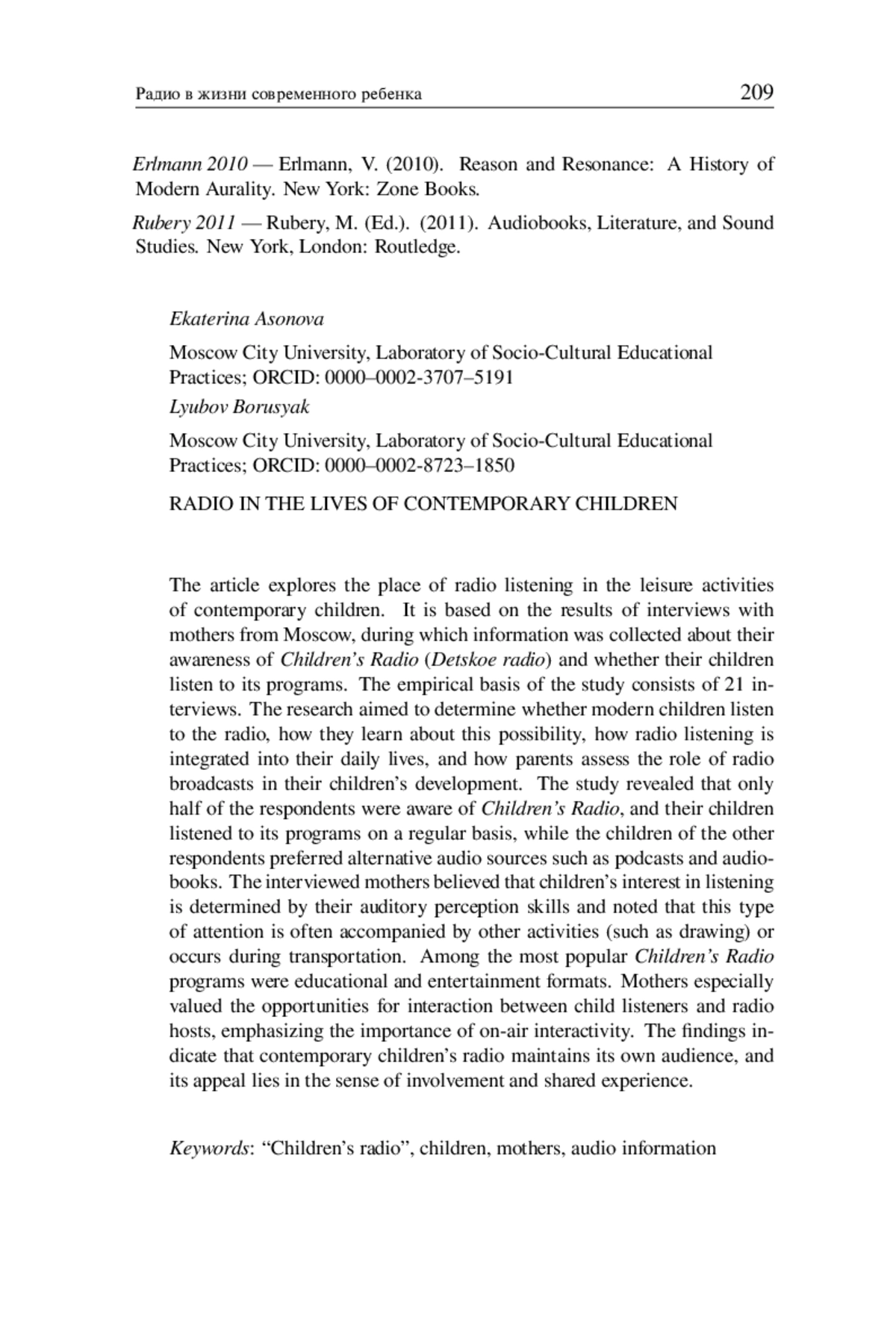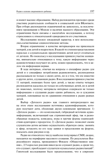 Статья посвящена определению места слушания радио в досуге современных детей, основана на результатах интервью с московскими матерями, в ходе которых была собрана информация о том, что знают матери о «Детском радио», слушают ли передачи «Детского радио» их дети. Эмпирической базой исследования стало 21 интервью. Целью исследования было определить, слушают ли современные дети радио, как узнают о возможности его слушать, каким образом слушание радио включено в их повседневную жизнь, как их родители оценивают роль слушания радиоэфиров для развития своих детей. Исследование показало, что лишь половина респонденток знали о «Детском радио» и их дети слушают его передачи на постоянной основе, дети остальных респонденток слушают другие источники (подкасты, аудиокниги). Опрошенные матери уверены, что интерес к слушанию определяется способностью к восприятию на слух, а также отмечают, что этот вид внимания часто сопровождается другой деятельностью (рисование) или совмещается с поездкой в транспорте. Среди востребованных программ на «Детском радио» назывались познавательноразвлекательные, особенной ценностью матери наделяли возможность взаимодействия ребенка-слушателя с ведущими радиопрограмм, интерактивность эфира. Исследование показало, что современное радио для детей имеет свою аудиторию, его привлекательность связана с возникающим у юных слушателей чувства причастности и совместности.