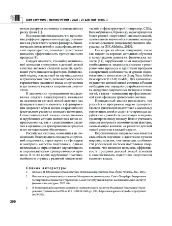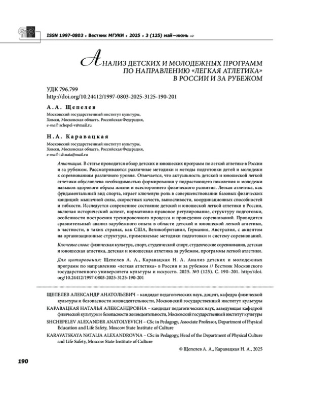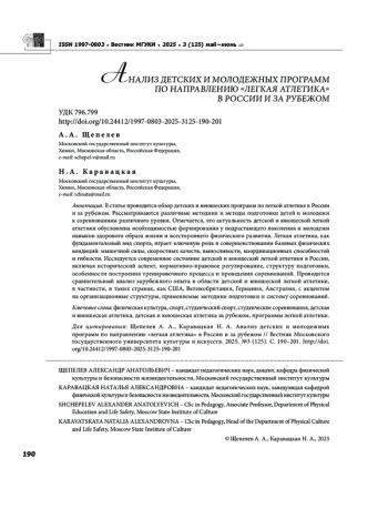 В статье проводится обзор детских и юношеских программ по легкой атлетике в России и за рубежом. Рассматриваются различные методики и методы подготовки детей и молодежи к соревнованиям различного уровня. Отмечается, что актуальность детской и юношеской легкой атлетики обусловлена необходимостью формирования у подрастающего поколения и молодежи навыков здорового образа жизни и всестороннего физического развития. Легкая атлетика, как фундаментальный вид спорта, играет ключевую роль в совершенствовании базовых физических кондиций: мышечной силы, скоростных качеств, выносливости, координационных способностей и гибкости. Исследуется современное состояние детской и юношеской легкой атлетики в России, включая исторический аспект, нормативно правовое регулирование, структуру подготовки, особенности построения тренировочного процесса и проведения соревнований. Проводится сравнительный анализ зарубежного опыта в области детской и юношеской легкой атлетики, в частности, в таких странах, как США, Великобритания, Германия, Австралия, с акцентом на организационные структуры, применяемые методики подготовки и систему соревнований.