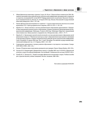 6. Правдов М. А. Легкая атлетика в системе дополнительного образования дошкольников // Приоритетные направления развития науки и образования: сборник материалов Международной научнопрактической конференции, Чебоксары, 13 августа 2018 года. Чебоксары: Общество с ограниченной ответственностью “Центр научного сотрудничества “Интерактив плюс”, 2018. С. 70-71. EDN: XWDFVR