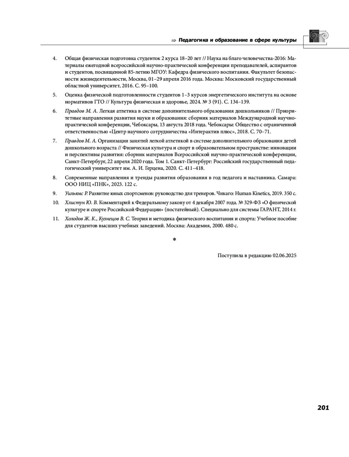 7. Правдов М. А. Организация занятий легкой атлетикой в системе дополнительного образования детей дошкольного возраста // Физическая культура и спорт в образовательном пространстве: инновации и перспективы развития: сборник материалов Всероссийской научно-практической конференции, Санкт-Петербург, 22 апреля 2020 года. Том 1. Санкт-Петербург: Российский государственный педагогический университет им. А. И. Герцена, 2020. С. 411-418. EDN: KGGPMM