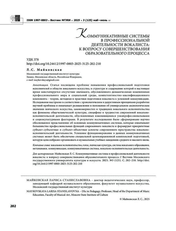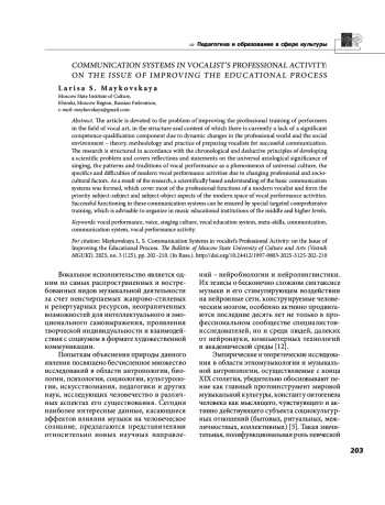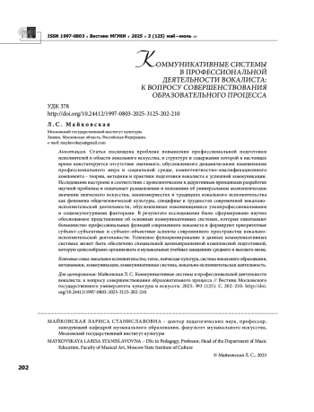 8. Майковская Л. С., Гемаддиев Д. И. Основные тенденции и ориентиры в современной эстрадноджазовой вокальной педагогике // Музыкальное искусство и образование. 2022. Т. 10. № 4. С. 89-100. EDN: HVJNRX