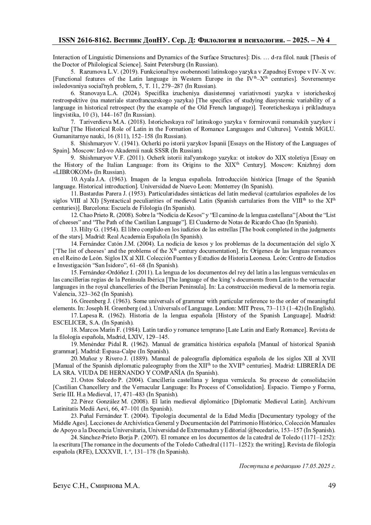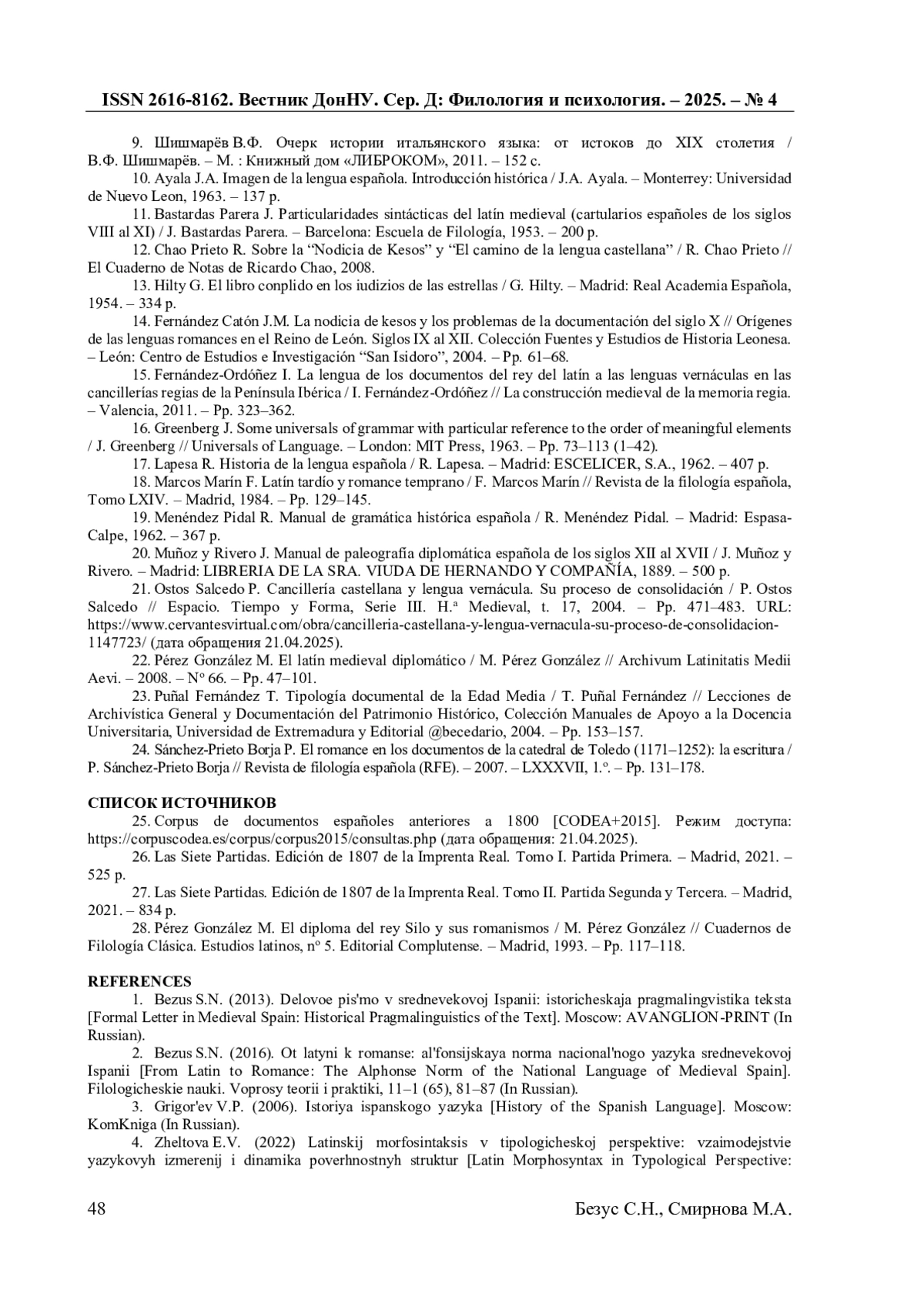 2. Безус С.Н. От латыни к романсе: альфонсийская норма национального языка средневековой Испании / С.Н. Безус // Филологические науки. Вопросы теории и практики. - 2016. - № 11-1 (65). - С. 81-87. EDN: WTIEGZ
