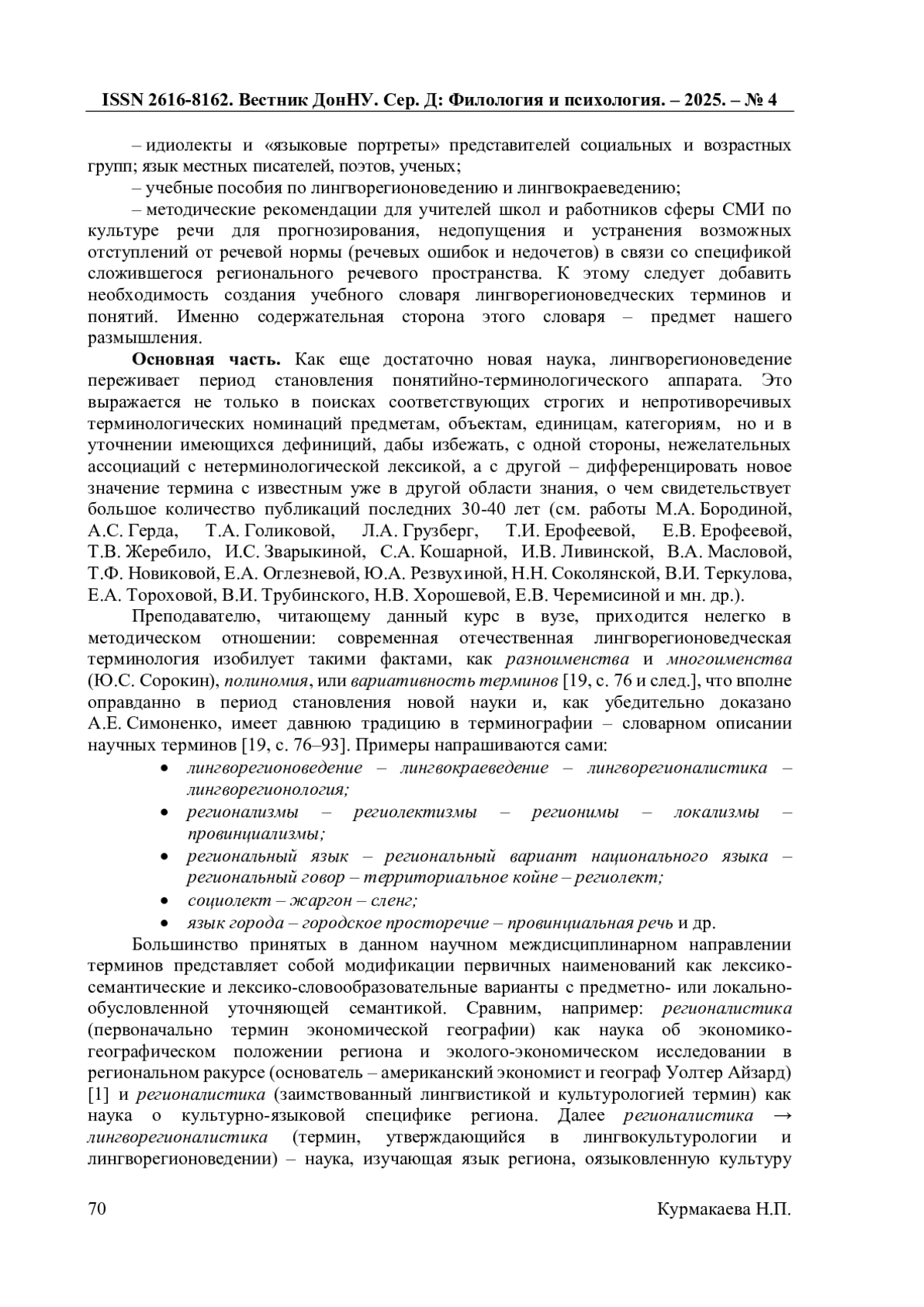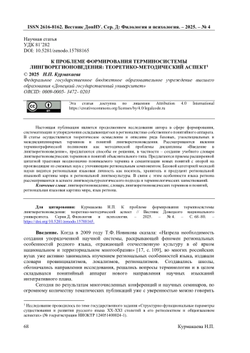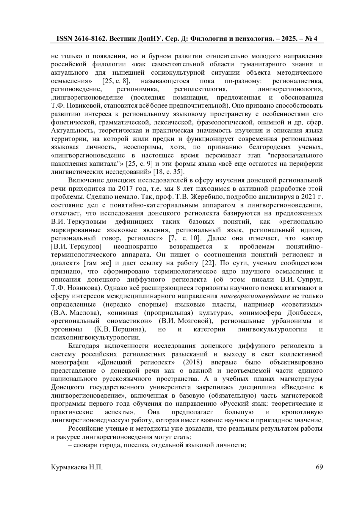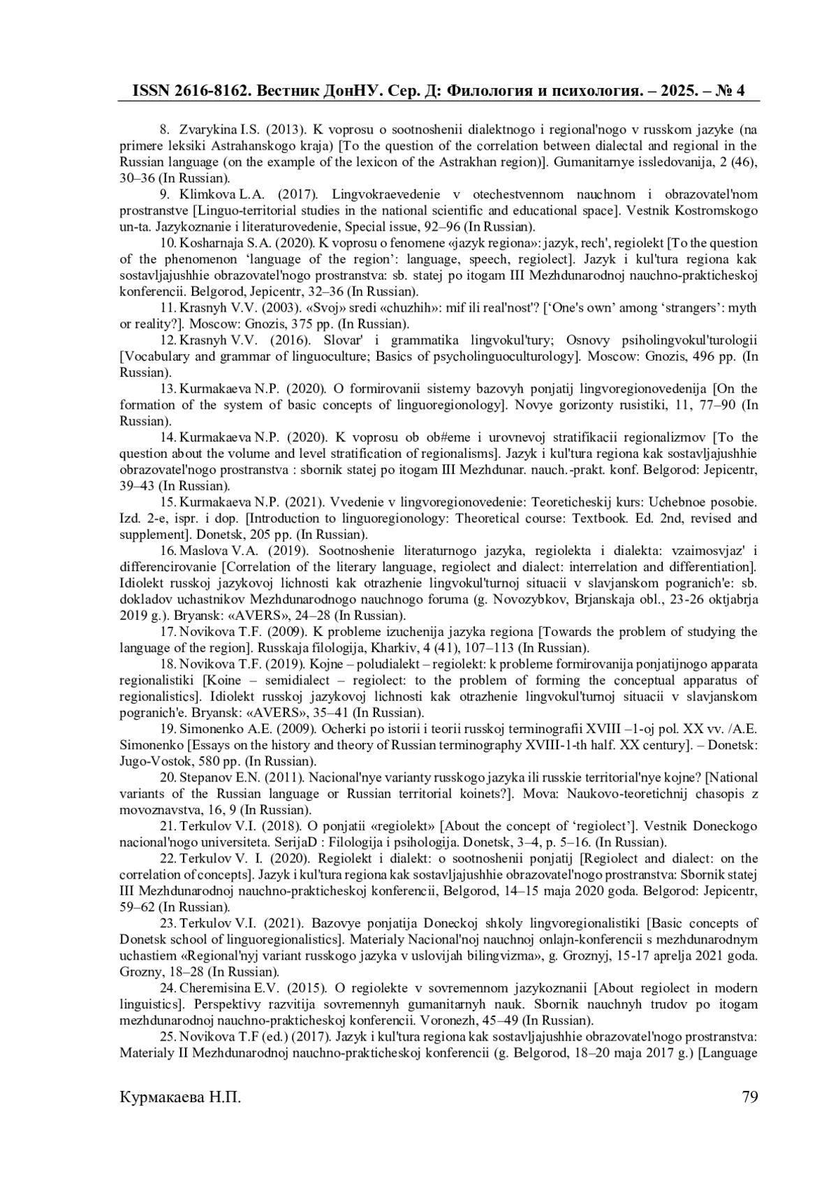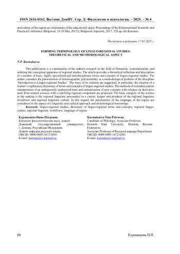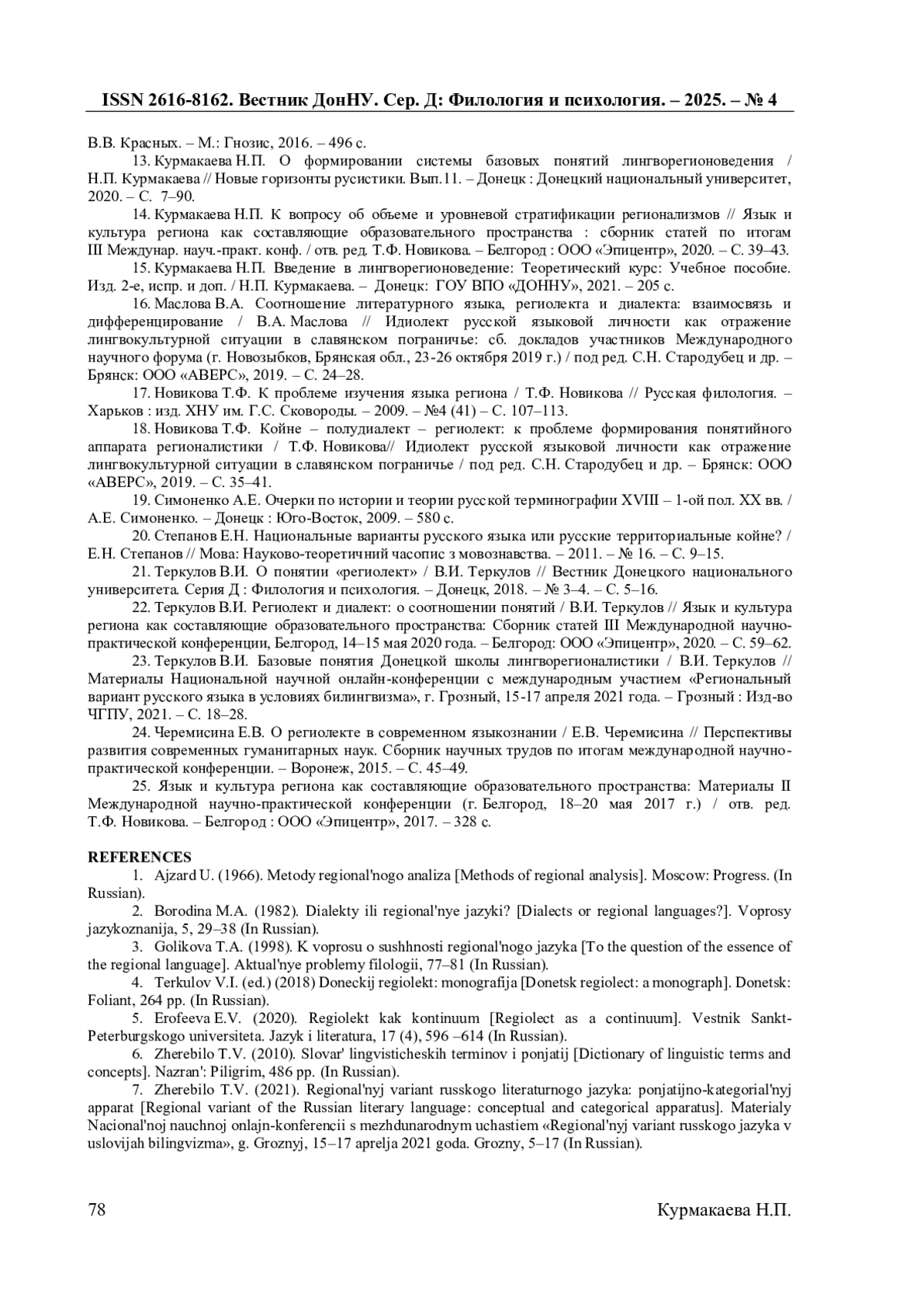 13. Курмакаева Н.П. О формировании системы базовых понятий лингворегионоведения / Н.П. Курмакаева // Новые горизонты русистики. Вып.11. - Донецк: Донецкий национальный университет, 2020. - С. 7-90. EDN: ITBDKV