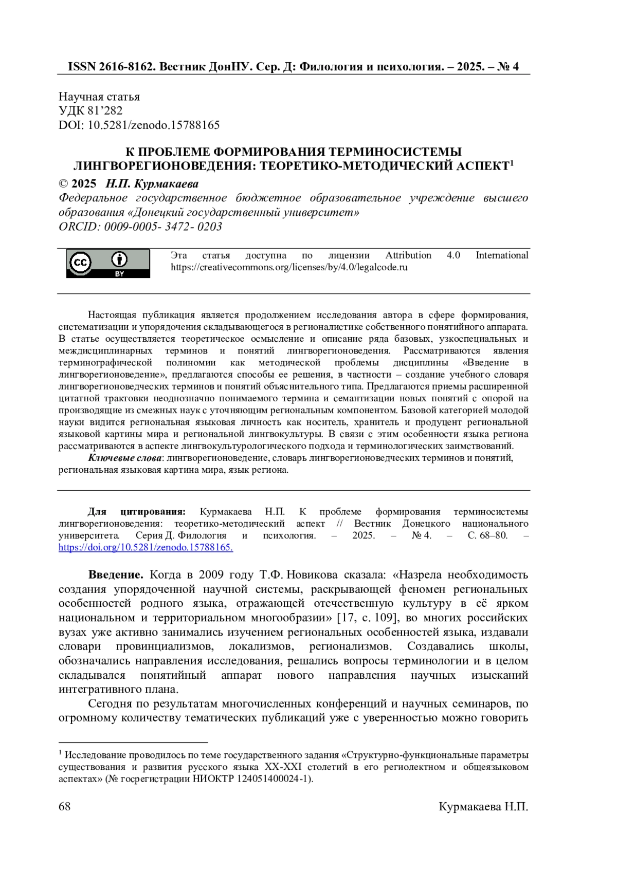23. Теркулов В.И. Базовые понятия Донецкой школы лингворегионалистики / В.И. Теркулов // Материалы Национальной научной онлайн-конференции с международным участием “Региональный вариант русского языка в условиях билингвизма”, г. Грозный, 15-17 апреля 2021 года. - Грозный: Изд-во ЧГПУ, 2021. - С. 18-28. EDN: LAMPKJ