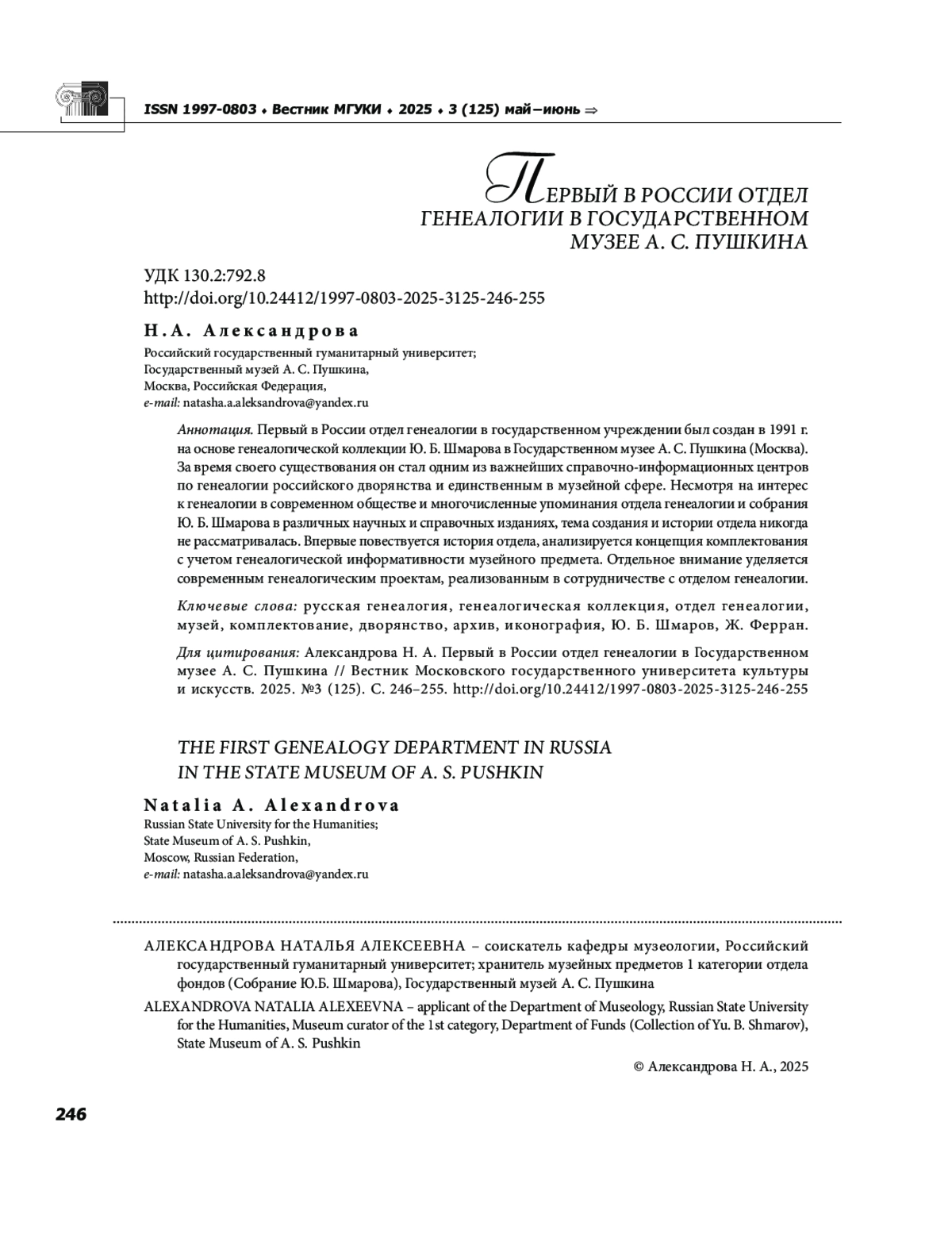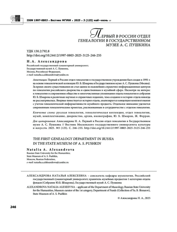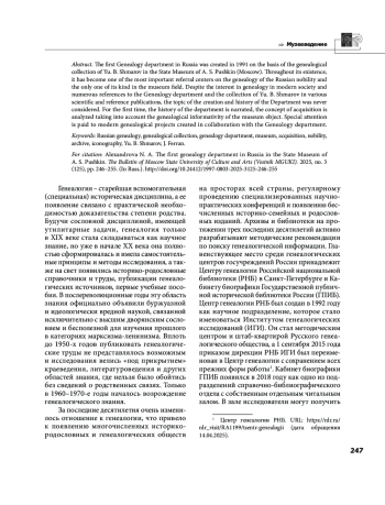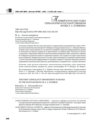 Первый в России отдел генеалогии в государственном учреждении был создан в 1991 г. на основе генеалогической коллекции Ю. Б. Шмарова в Государственном музее А. С. Пушкина (Москва). За время своего существования он стал одним из важнейших справочно-информационных центров по генеалогии российского дворянства и единственным в музейной сфере. Несмотря на интерес к генеалогии в современном обществе и многочисленные упоминания отдела генеалогии и собрания Ю. Б. Шмарова в различных научных и справочных изданиях, тема создания и истории отдела никогда не рассматривалась. Впервые повествуется история отдела, анализируется концепция комплектования с учетом генеалогической информативности музейного предмета. Отдельное внимание уделяется современным генеалогическим проектам, реализованным в сотрудничестве с отделом генеалогии.