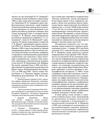 21. Рыкова О. В. М. И. Смирнов и его компьютерный банк данных по генеалогии // Генеалогический вестник. Выпуск 53. Санкт-Петербург, 2016. С. 62-71.