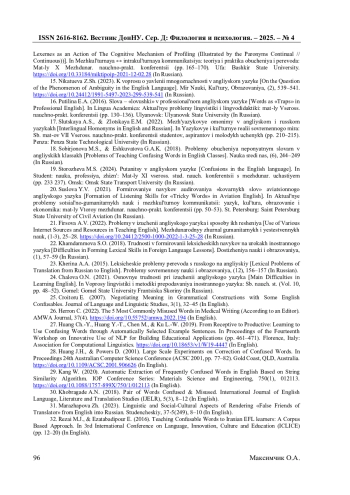 13. Меньшикова Ю.О. Разнокоренные паронимы как часть лексической системы английского языка / Ю.О. Меньшикова // Человек и язык: Мат-лы междунар. научно-практ. конфер. “Человек и язык”, посвящ. памяти проф. М.Я. Блоха, Москва, 23-24 ноября 2023 года. - Москва: МПГУ, 2024. - С. 257-262. EDN: XEZNMC