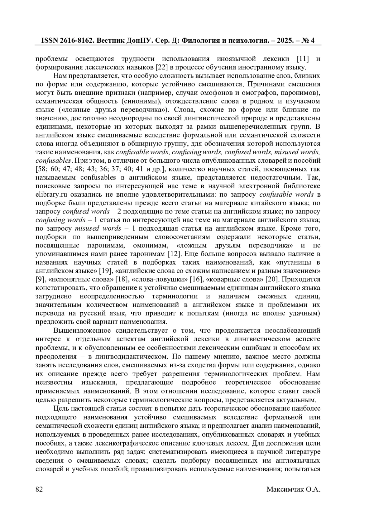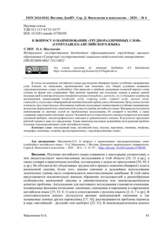 В статье на материале английского языка рассмотрена обширная группа устойчиво смешиваемых слов, близких по написанию, произношению или значению, под общим условным названием «трудноразличимые слова» (confusables). Они приводят к ошибкам, вызванным подменой верного слова схожим по форме или содержанию. При наличии терминов для отдельных единиц в рамках данной неоднородной в лингвистическом отношении группы ( homophones, paronyms, etc. ) и большого количества англоязычных наименований ( confusable words, confusing words, confused words, misused words, confusables ), отсутствует общепринятый лингвистический термин для ее обозначения.