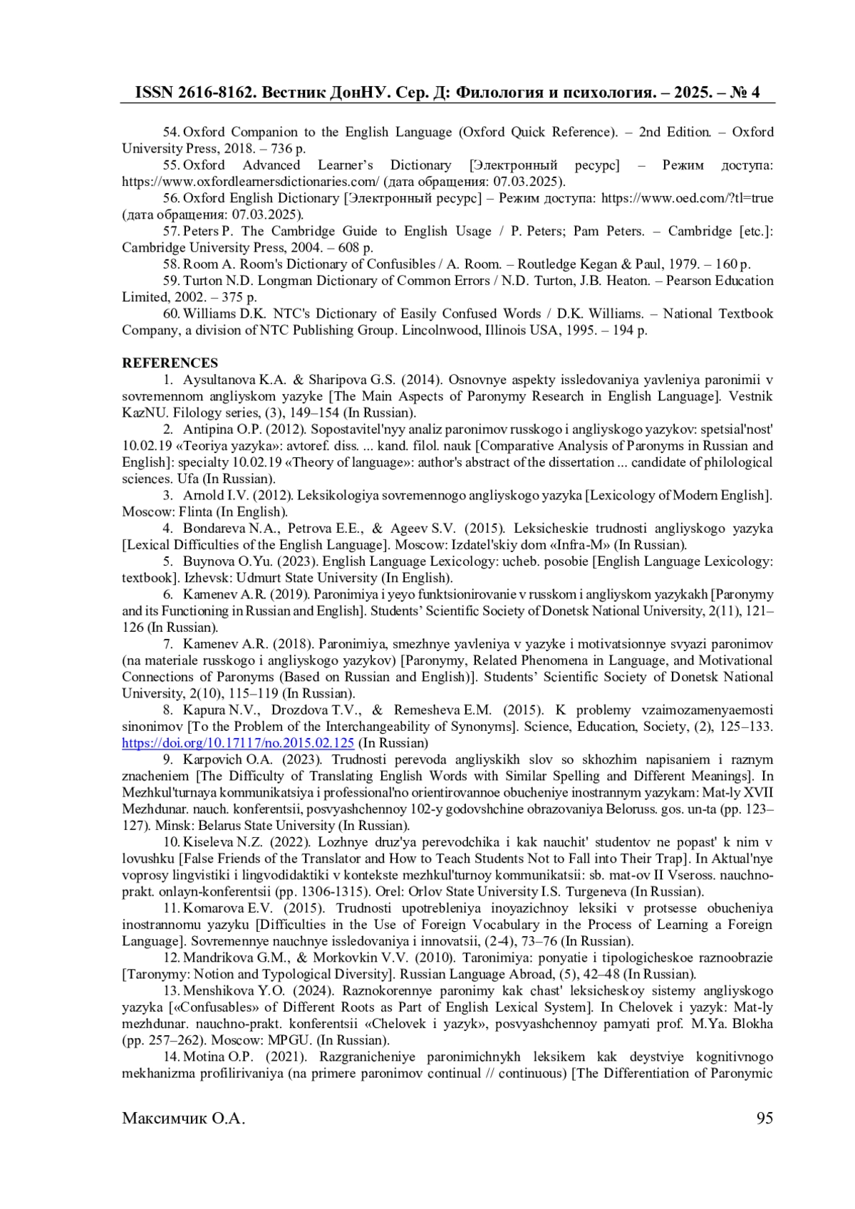 6. Каменев А.Р. Паронимия и её функционирование в русском и английском языках / А. Р. Каменев // Вестник студенческого научного общества ГОУ ВПО “Донецкий национальный ун-т”. - 2019. - Т. 2, № 11. - С. 121-126.