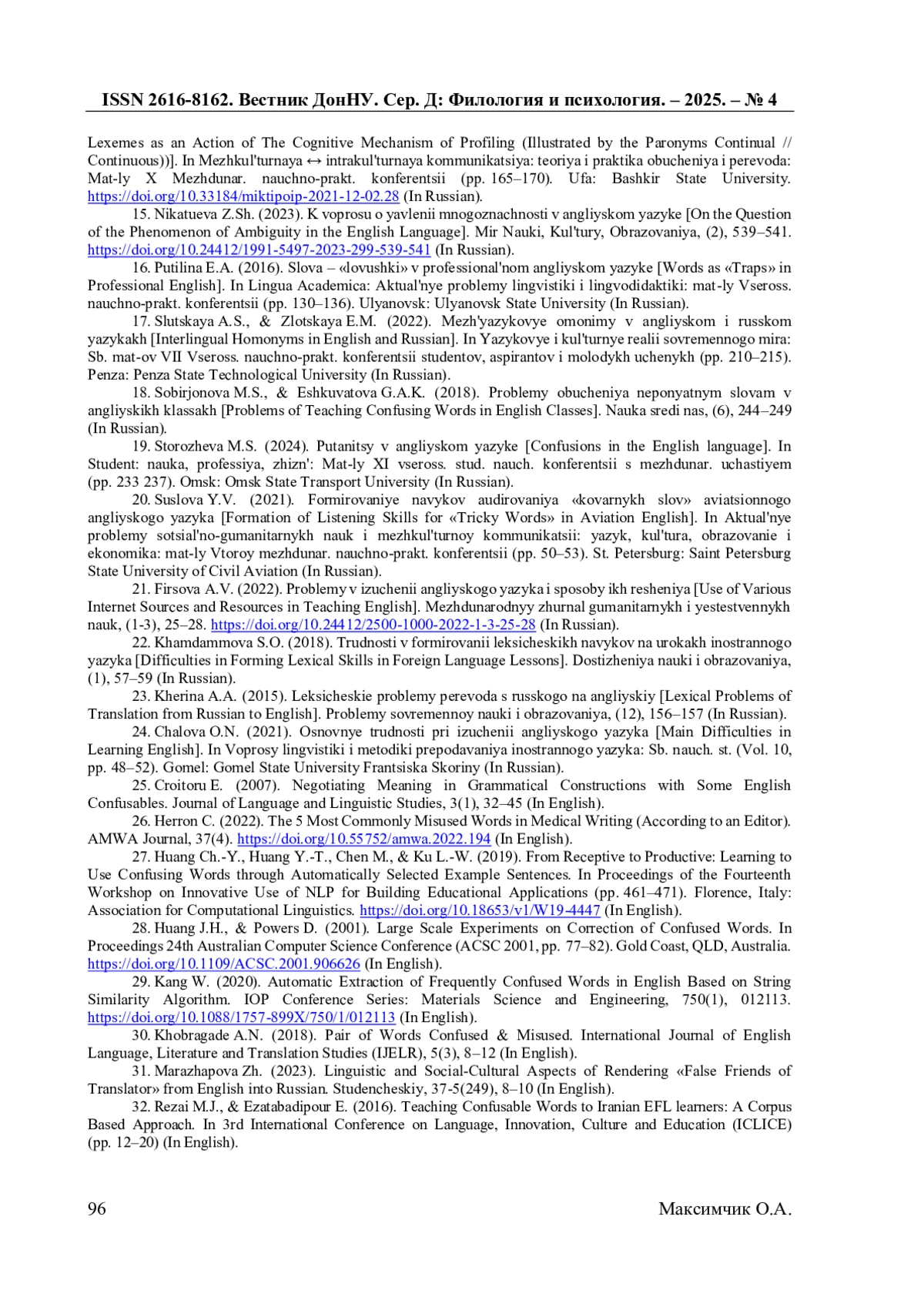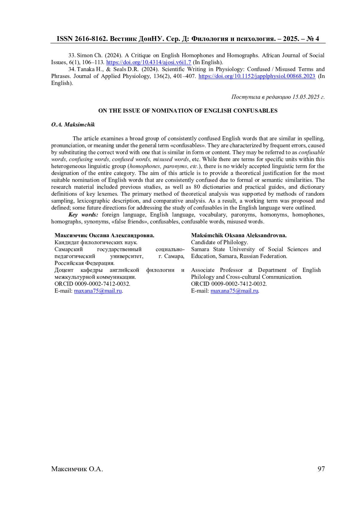 33. Simon Ch. A Critique on English Homophones and Homographs / Ch. Simon // African Journal of Social Issues. - 2024. - Vol. 6, No. 1. - P. 106-113. DOI: 10.4314/ajosi.v6i1.7 EDN: GMBDOR