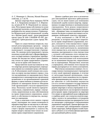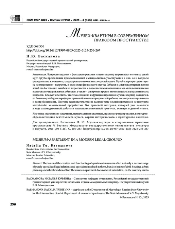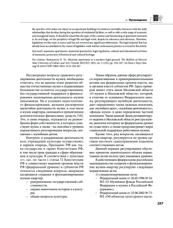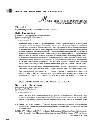 Вопросы создания и функционирования музеев квартир затрагивают не только узкий круг сугубо профильных правоотношений и специалистов, участвующих в них, но и вопросы гражданского, жилищного, градостроительного и иных отраслей права. Музей квартира существует не изолированно напротив, в силу специфики своего статуса (объект в многоквартирном жилом доме) его бытование неизбежно пересекается с повседневными отношениями, складывающимися в ходе эксплуатации жилых объектов, а также с широким кругом экономических и управленческих вопросов. Следует отметить, что тема создания и функционирования музеев квартир находится, по большому счёту, на периферии правовой жизни и юридической работы, несмотря на актуальность и востребованность. Поэтому законодательство на данную тему немногочисленно и не получило какой либо значительной проработки. Тот правовой материал, который уже накоплен в ходе законодательной работы и правоприменительной практики, освещен в данной статье.