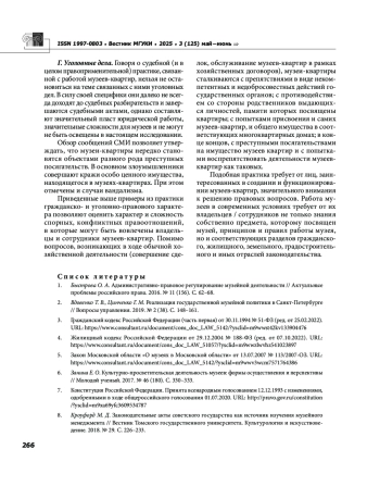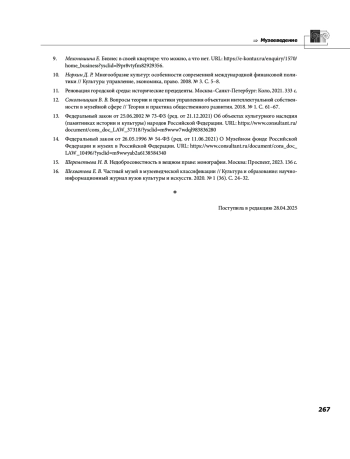 8. Кроуфорд М. Д. Законодательные акты советского государства как источник изучения музейного менеджмента // Вестник Томского государственного университета. Культурология и искусствоведение. 2018. № 29. С. 226-233. EDN: YTYZUF