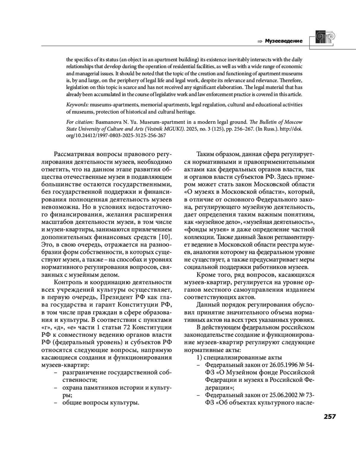 1. Быстрова О. А. Административно-правовое регулирование музейной деятельности // Актуальные проблемы российского права. 2016. № 11 (156). С. 62-68. EDN: WKFIUT