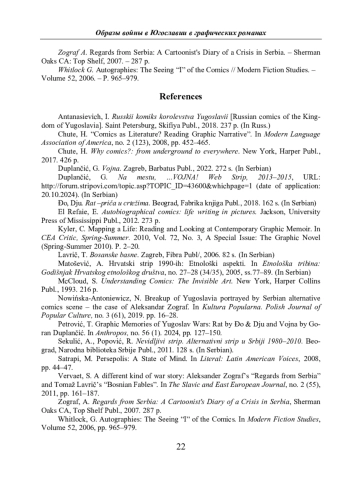 12. Nowińska‑Antoniewicz, N. “Breakup of Yugoslavia portrayed by Serbian alternative comics scene – the case of Aleksandar Zograf”. *Kultura Popularna. Polish Journal of Popular Culture*, no. 3 (61), 2019, pp. 16–28.