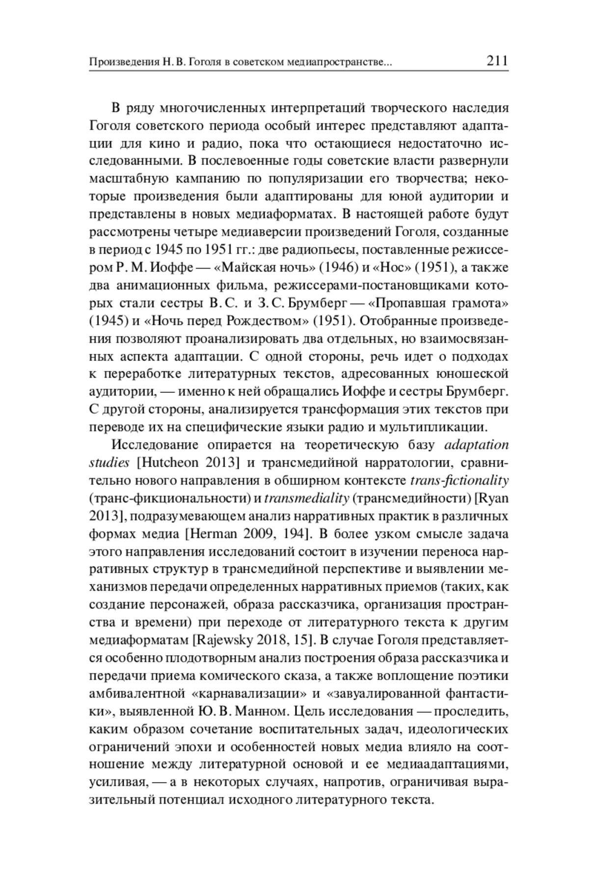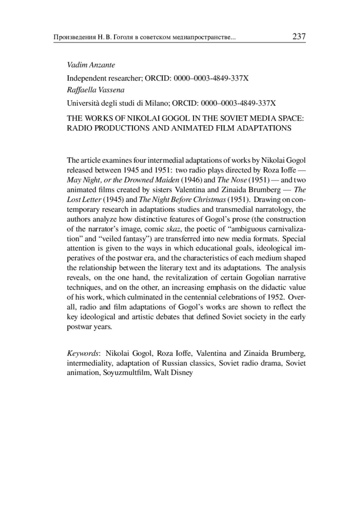 В ряду многочисленных интерпретаций творческого наследия Гоголя советского периода особый интерес представляют адаптации для кино и радио, пока что остающиеся недостаточно исследованными. В послевоенные годы советские власти развернули масштабную кампанию по популяризации его творчества; некоторые произведения были адаптированы для юной аудитории и представлены в новых медиаформатах. В настоящей работе будут рассмотрены четыре медиаверсии произведений Гоголя, созданные в период с 1945 по 1951 гг.: две радиопьесы, поставленные режиссером Р. М. Иоффе — «Майская ночь» (1946) и «Нос» (1951), а также два анимационных фильма, режиссерами-постановщиками которых стали сестры В. С. и З. С. Брумберг — «Пропавшая грамота» (1945) и «Ночь перед Рождеством» (1951). Отобранные произведения позволяют проанализировать два отдельных, но взаимосвязанных аспекта адаптации. С одной стороны, речь идет о подходах к переработке литературных текстов, адресованных юношеской аудитории, — именно к ней обращались Иоффе и сестры Брумберг. С другой стороны, анализируется трансформация этих текстов при переводе их на специфические языки радио и мультипликации.