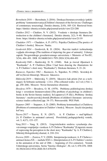 5. Зверева Т. В. Интерпретация рассказов А. П. Чехова в анимации конца XX - начала XXI вв. // Вестник Удмуртского университета. Серия “История и филология”. 2020. Т. 30, вып. 5. С. 870-876. DOI: 10.35634/2412-9534-2020-30-5-870-876 EDN: SPRUWG