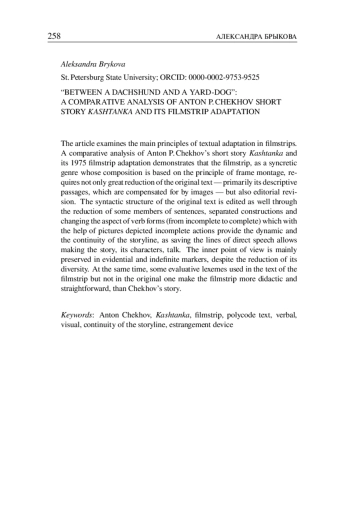 The article examines the main principles of textual adaptation in filmstrips. A comparative analysis of Anton P. Chekhov’s short story Kashtanka and its 1975 filmstrip adaptation demonstrates that the filmstrip, as a syncretic genre whose composition is based on the principle of frame montage, requires not only great reduction of the original text — primarily its descriptive passages, which are compensated for by images — but also editorial revision. The syntactic structure of the original text is edited as well through the reduction of some members of sentences, separated constructions and changing the aspect of verb forms (from incomplete to complete) which with the help of pictures depicted incomplete actions provide the dynamic and the continuity of the storyline, as saving the lines of direct speech allows making the story, its characters, talk. The inner point of view is mainly preserved in evidential and indefinite markers, despite the reduction of its diversity. At the same time, some evaluative lexemes used in the text of the filmstrip but not in the original one make the filmstrip more didactic and straightforward, than Chekhov’s story.