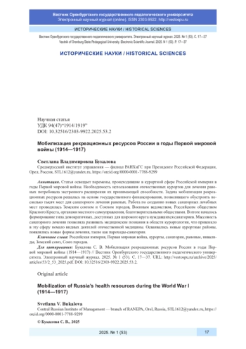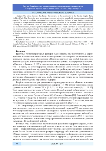 Статья освещает перемены, происходившие в курортной сфере Российской империи в годы Первой мировой войны. Необходимость использования отечественных курортов для лечения раненых потребовала экстренного расширения их принимающей способности. Задача мобилизации рекреационных ресурсов решалась на основе государственного финансирования, позволившего обустроить несколько тысяч мест для санаторного лечения раненых. Работа по созданию новых санаторных лечебных мест проводилась Земским союзом и Союзом городов, Военным ведомством, Российским обществом Красного Креста, органами местного самоуправления, благотворительными обществами. В итоге началось формирование типа демократичных, доступных для широкого круга нуждавшихся санаториев. Массовость санаторного лечения позволяла развивать медицинские познания в области курортологии, что привлекло в эту сферу немало видных деятелей отечественной медицины. Осваивались новые курортные районы, появлялись новые формы лечения, такие как пароходы-санатории.