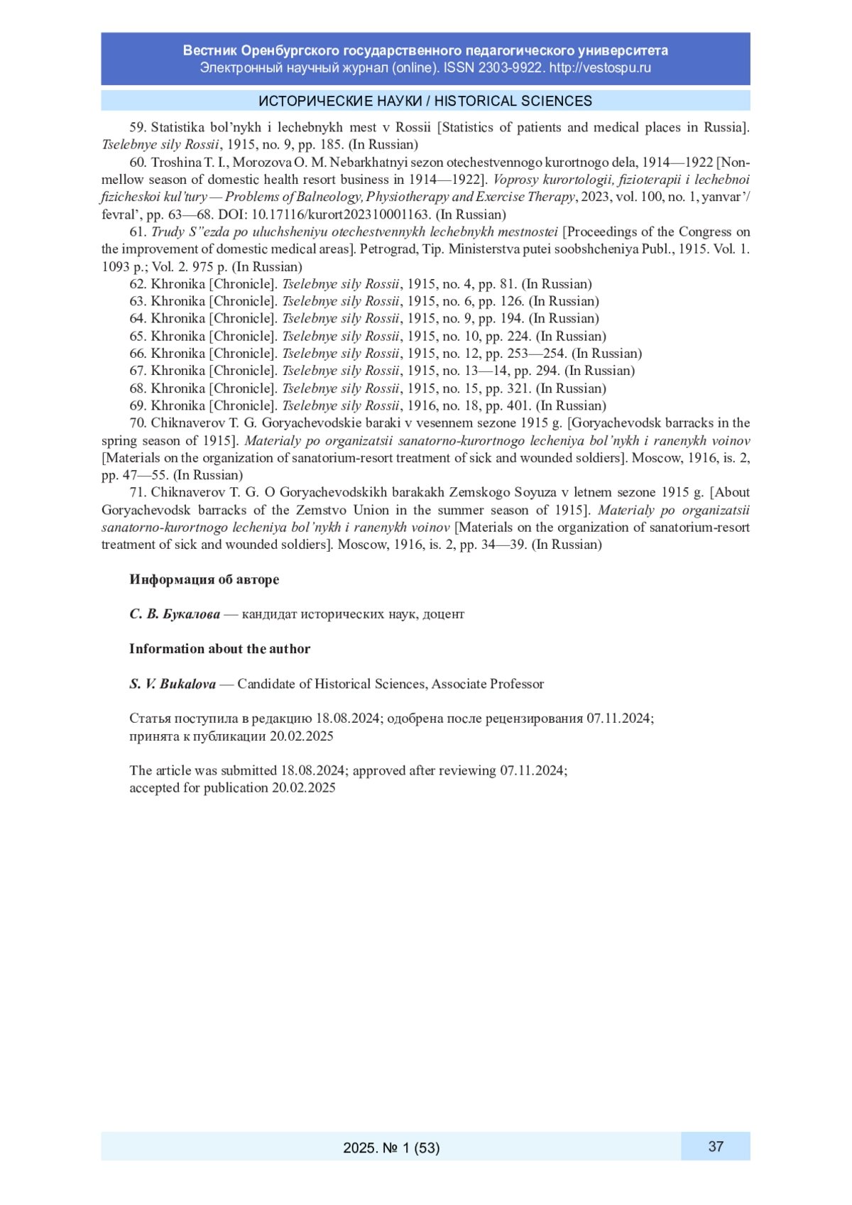 60. Трошина Т. И., Морозова О. М. Небархатный сезон отечественного курортного дела, 1914-1922 // Вопросы курортологии, физиотерапии и лечебной физической культуры. 2023. Т. 100, № 1, январь/февраль. С. 63-68. DOI: 10.17116/kurort202310001163 EDN: SPBTMN