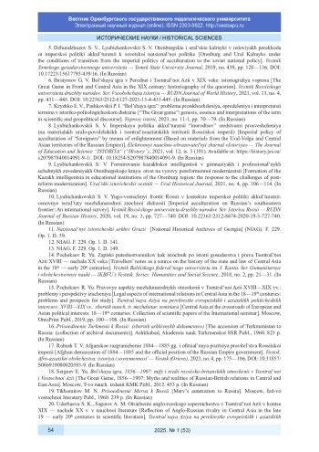 8. Любичанковский С. В. Имперская политика аккультурации “инородцев” средствами просвещения (на материалах урало-поволжских и центральноазиатских территорий Российской империи) // Электронный научно-образовательный журнал “История”. 2021. T. 12, вып. 3 (101). URL: https://history.jes.su/s207987840014091-9-1/. DOI: 10.18254/S207987840014091-9 EDN: CDZZFY