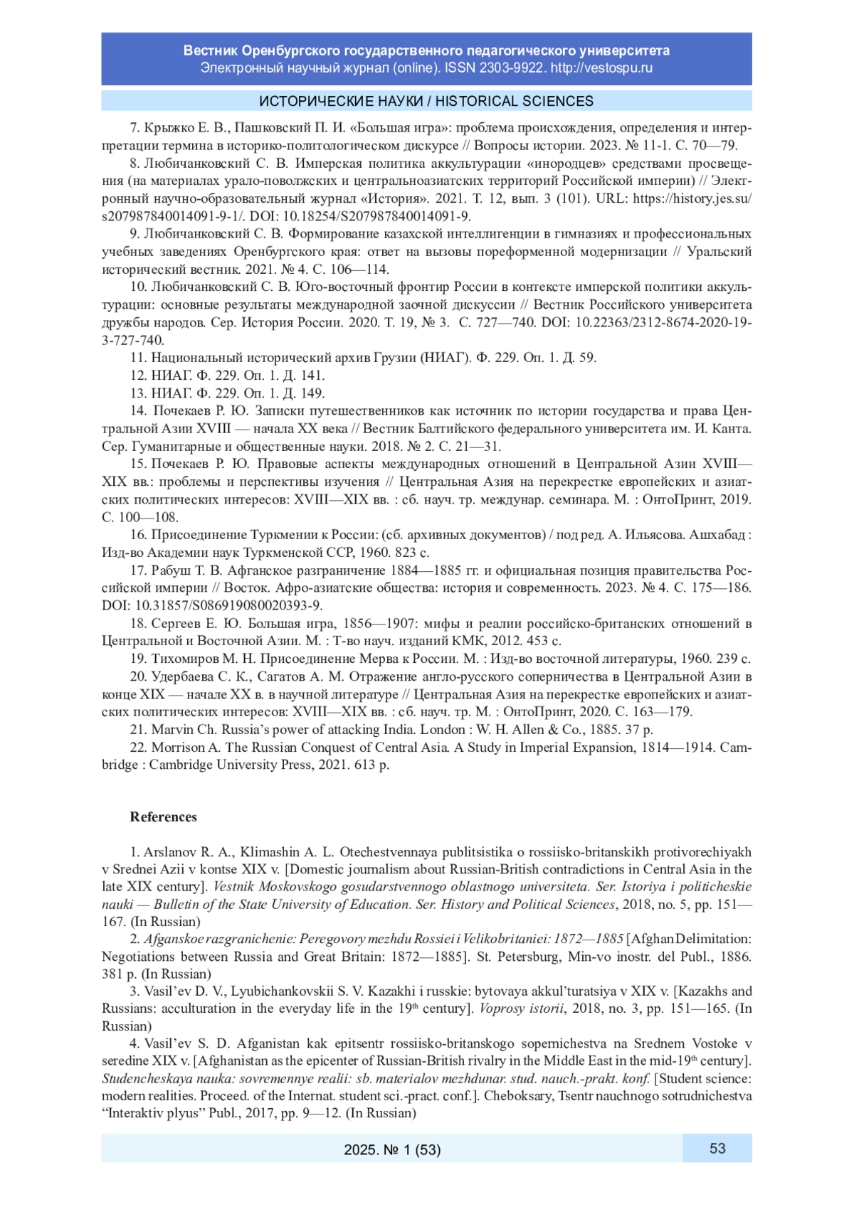 6. Ибрайымов Г. В. Большая игра в Передней и Центральной Азии в XIX веке: историография вопроса // Вестник Российского университета дружбы народов. Сер. Всеобщая история. 2021. Т. 13, № 4. С. 431-445. DOI: 10.22363/2312-8127-2021-13-4-431-445