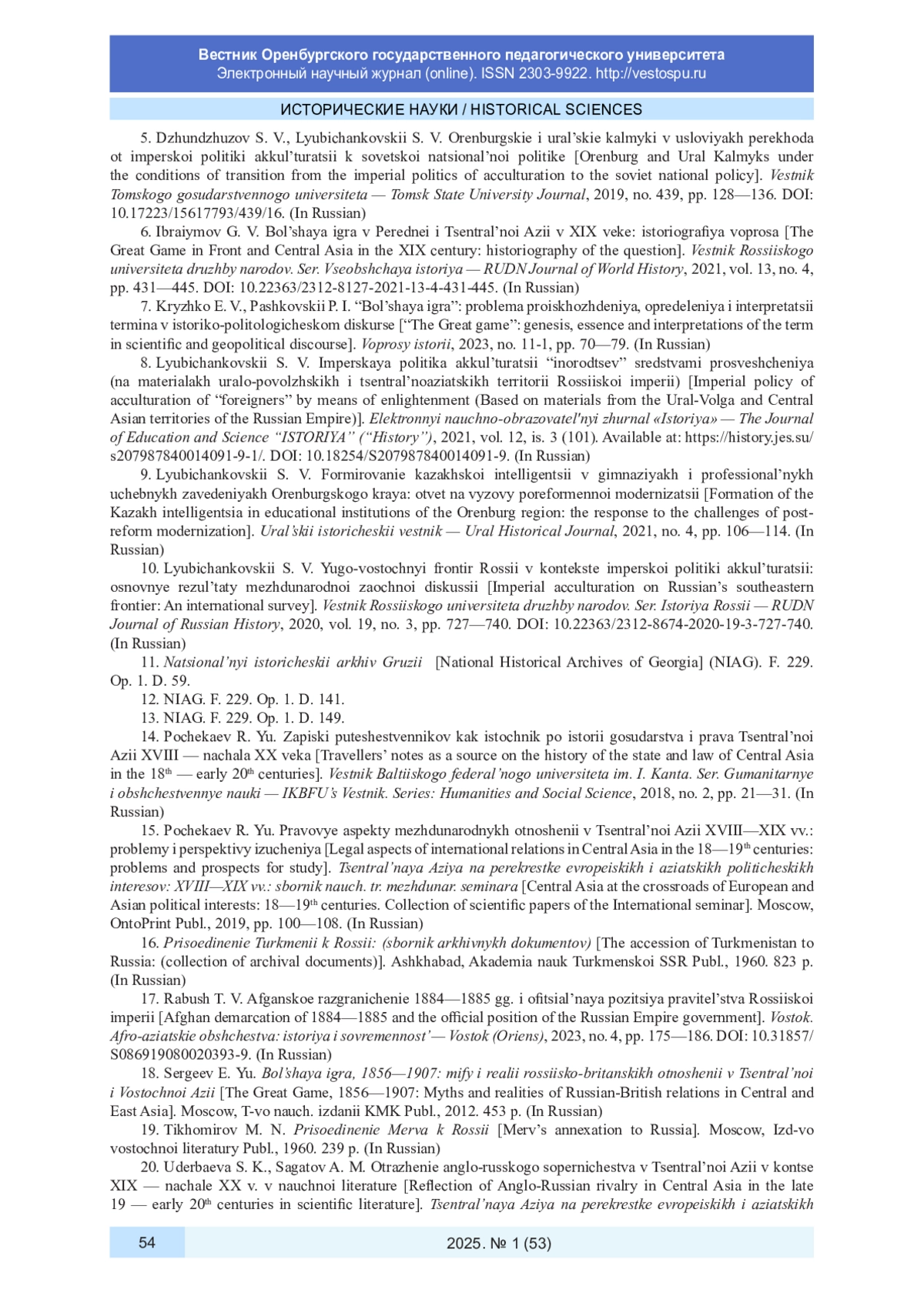 10. Любичанковский С. В. Юго-восточный фронтир России в контексте имперской политики аккультурации: основные результаты международной заочной дискуссии // Вестник Российского университета дружбы народов. Сер. История России. 2020. Т. 19, № 3. C. 727-740. DOI: 10.22363/2312-8674-2020-19-3-727-740