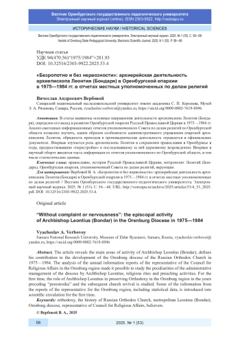В статье выявлены основные направления деятельности архиепископа Леонтия (Бондаря), определен его вклад в развитие Оренбургской епархии Русской Православной Церкви в 1975-1984 гг. Анализ ежегодных информационных отчетов уполномоченного Совета по делам религий по Оренбургской области позволил изучить, каким образом особенности административного управления епархией архиепископа Леонтия, обрядность приходов и проповедническая деятельность отражается в официальных документах. Впервые изучается роль архиепископа Леонтия в сохранении православия в Оренбуржье в годы, предшествовавшие «перестройке» и последовавшему за ней церковному возрождению. Впервые в научный оборот вводится часть информации из отчетов уполномоченного по Оренбургской области, в том числе статистические данные.