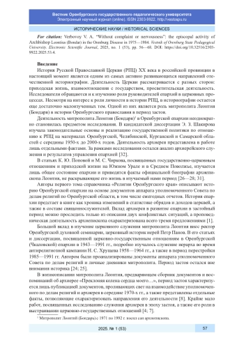 История Русской Православной Церкви (РПЦ) XX века в российской провинции в настоящий момент является одним из самых активно развивающихся направлений отечественной историографии. Деятельность Церкви рассматривается с разных сторон: приходская жизнь, взаимоотношения с государством, просветительская деятельность. Исследователи обращаются и к изучению роли руководителей епархий в церковных процессах. Несмотря на интерес к роли личности в истории РПЦ, в историографии остается еще достаточно малоизученных тем. Одной из них является роль митрополита Леонтия (Бондаря) в истории Оренбургского православия в период застоя.