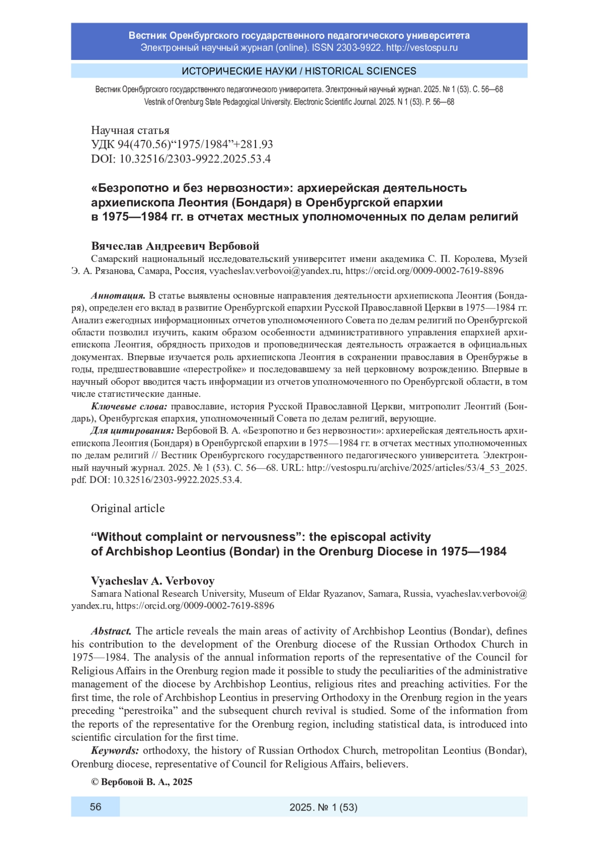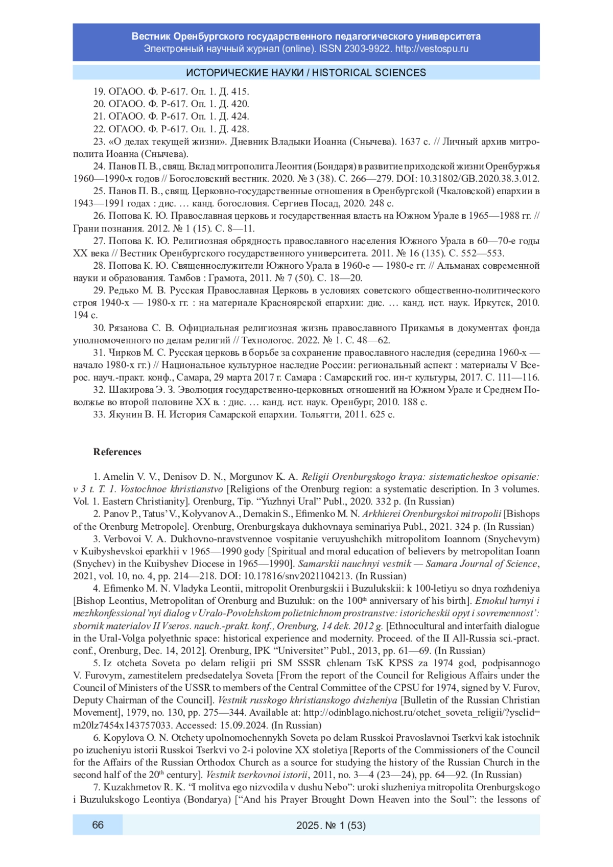 24. Панов, П. Вклад митрополита Леонтия (Бондаря) в развитие приходской жизни Оренбуржья 1960-1990-х годов / П. Панов // Богословский вестник. - 2020. - № 3(38). - С. 266-279. DOI: 10.31802/GB.2020.38.3.012 EDN: MFNHMM