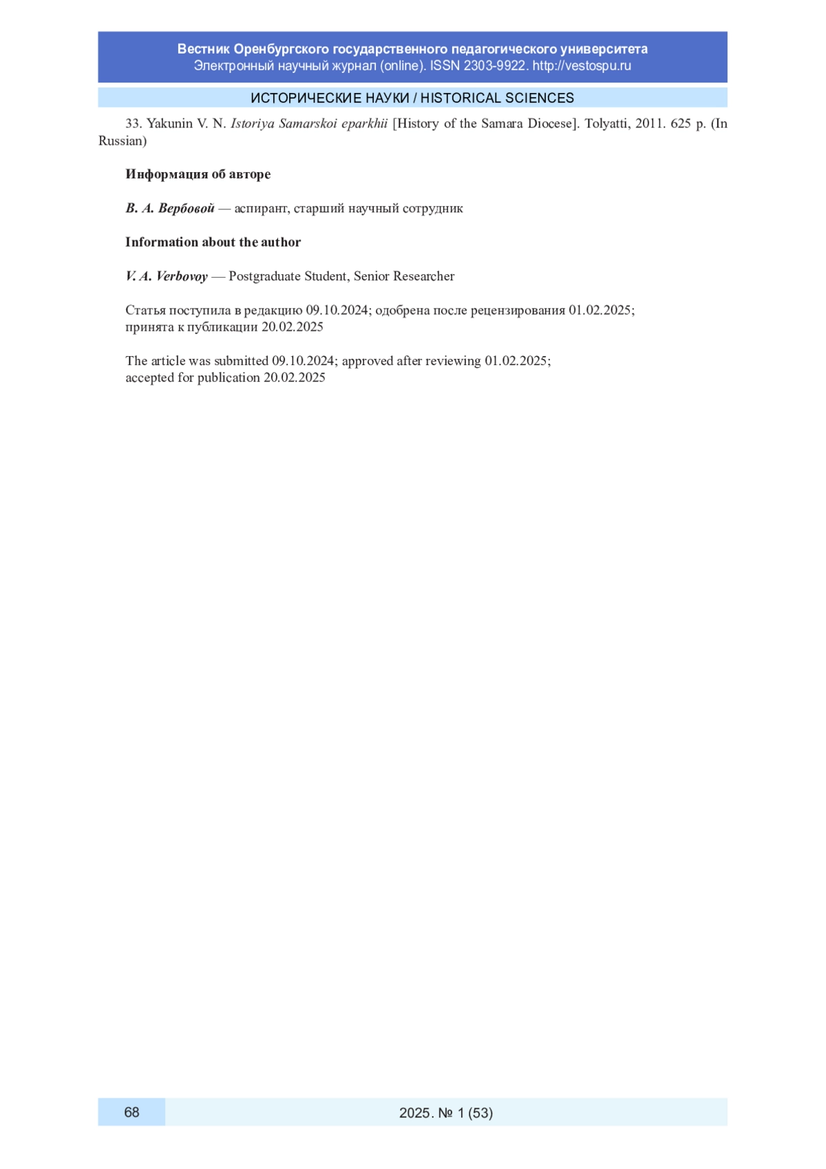 3. Вербовой В. А. Духовно-нравственное воспитание верующих митрополитом Иоанном (Снычевым) в Куйбышевской епархии в 1965-1990 годы // Самарский научный вестник. 2021. Т. 10, № 4. С. 214-218. DOI: 10.17816/snv2021104213 EDN: NMVXLF