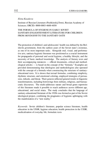 The protection of children’s and adolescents’ health was defined by the Bolshevik government, from the earliest years of the Soviet state’s existence, as one of its most important tasks. Alongside oral, visual, and performative arts, sanitary-hygienic literature was positioned as a crucial instrument for propaganda of personal and social hygiene, a healthy lifestyle, and the necessity of basic medical knowledge. The analysis of literary texts and their accompanying metatexts — official documents, critical and methodological articles — is based on the concept of the “formula.” Examples are provided demonstrating that ideologists and methodologists also operated with the concept of a formula when constructing the structure of sanitaryeducational texts. It is shown that textual formulas, combining simplicity, rhythmic structure, and emotional coloring, employed strategies of persuasion, ridicule, and threat. Their genesis reflected general trends in linguistic transformations, including borrowings from military, religious, and bureaucratic discourses. The multi-addressee nature and broad genre repertoire of this literature made it possible to reach audiences across different age, educational, and social strata. The study concludes that the language of sanitary-educational literature of the 1920s was formed as part of the Soviet ideological project, combining the pragmatics of hygienic upbringing with the manifestation of a “new reality.”