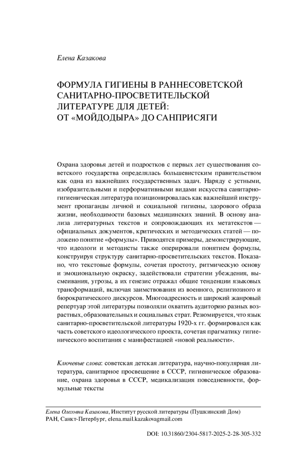 Охрана здоровья детей и подростков с первых лет существования советского государства определялась большевистским правительством как одна из важнейших государственных задач. Наряду с устными, изобразительными и перформативными видами искусства санитарногигиеническая литература позиционировалась как важнейший инструмент пропаганды личной и социальной гигиены, здорового образа жизни, необходимости базовых медицинских знаний. В основу анализа литературных текстов и сопровождающих их метатекстов - официальных документов, критических и методических статей - положено понятие «формулы». Приводятся примеры, демонстрирующие, что идеологи и методисты также оперировали понятием формулы, конструируя структуру санитарно-просветительских текстов. Показано, что текстовые формулы, сочетая простоту, ритмическую основу и эмоциональную окраску, задействовали стратегии убеждения, высмеивания, угрозы, а их генезис отражал общие тенденции языковых трансформаций, включая заимствования из военного, религиозного и бюрократического дискурсов. Многоадресность и широкий жанровый репертуар этой литературы позволяли охватить аудиторию разных возрастных, образовательных и социальных страт. Резюмируется, что язык санитарно-просветительской литературы 1920-х гг. формировался как часть советского идеологического проекта, сочетая прагматику гигиенического воспитания с манифестацией «новой реальности».