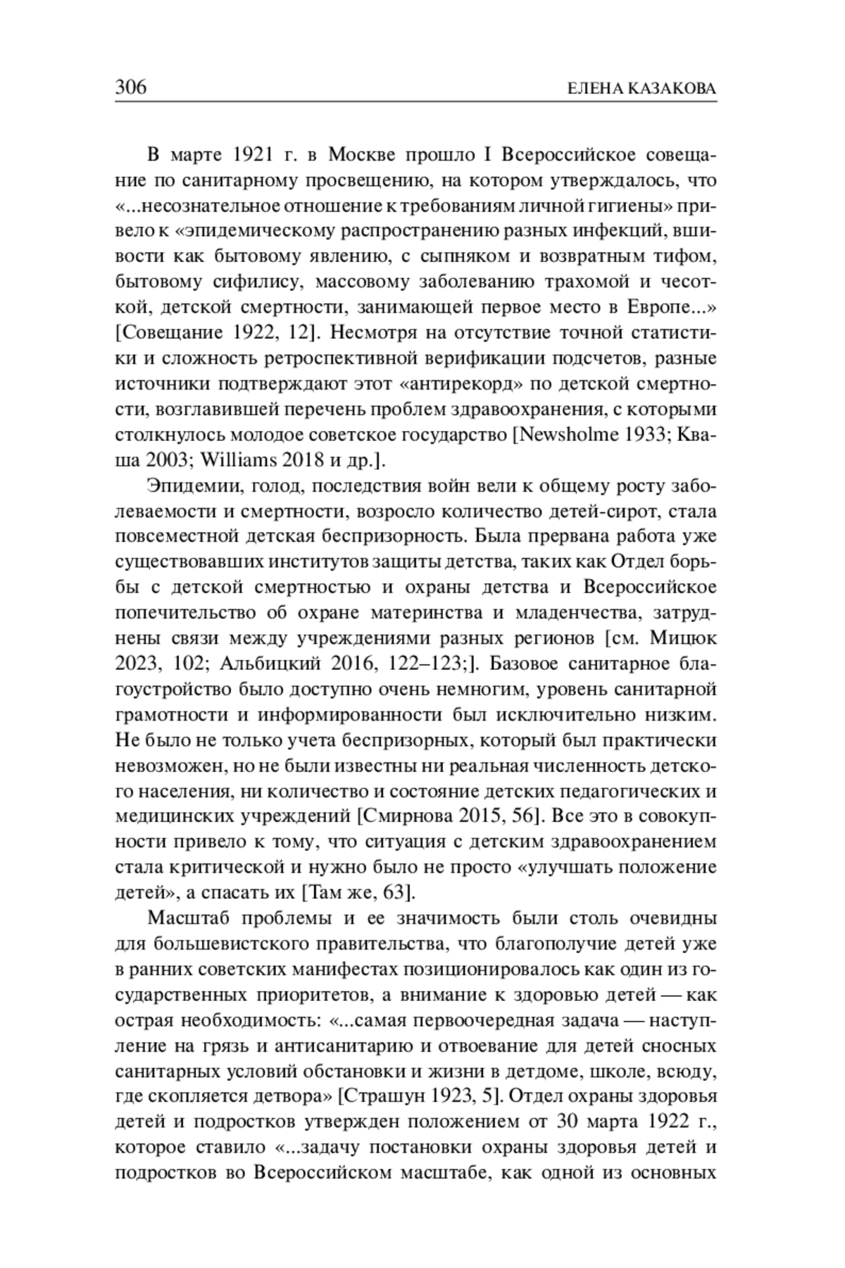 В марте 1921 г. в Москве прошло I Всероссийское совещание по санитарному просвещению, на котором утверждалось, что «… несознательное отношение к требованиям личной гигиены» привело к «эпидемическому распространению разных инфекций, вшивости как бытовому явлению, с сыпняком и возвратным тифом, бытовому сифилису, массовому заболеванию трахомой и чесоткой, детской смертности, занимающей первое место в Европе…» [Совещание 1922, 12]. Несмотря на отсутствие точной статистики и сложность ретроспективной верификации подсчетов, разные источники подтверждают этот «антирекорд» по детской смертности, возглавившей перечень проблем здравоохранения, с которыми столкнулось молодое советское государство [Newsholme 1933; Кваша 2003; Williams 2018 и др.].