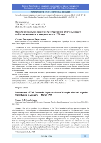 В статье рассматривается участие яицких казаков в военных действиях против мятежных калмыков, возложенные на них разведывательная деятельность и прием возвращавшихся на родину калмыков и других российских подданных, бежавших из калмыцкого плена. Сведения о подготовке к откочевке калмыков в Джунгарию в правительственных кругах России были встречены с недоверием. Яицкое казачье войско в январе 1771 г. оказалось единственной военной силой на пути уходившей мятежной Калмыцкой орды. Казачьей команде войскового старшины А. Митрясова удалось нанести поражение одной калмыцкой партии на Нижней яицкой линии и привести в повиновение и удержать от побега улус нойона Асархи численностью до двух тысяч кибиток. Готовность казаков к сопротивлению заставила наместника Калмыцкого ханства Убаши отказаться от набега на Яицкий городок и другие казачьи селения. Однако в силу объективных и субъективных причин остановить бегущую Калмыцкую орду Яицкое войско было не в состоянии. Большинство яицких казаков отказались от участия в дальнейшем преследовании ушедших за Яик калмыков.