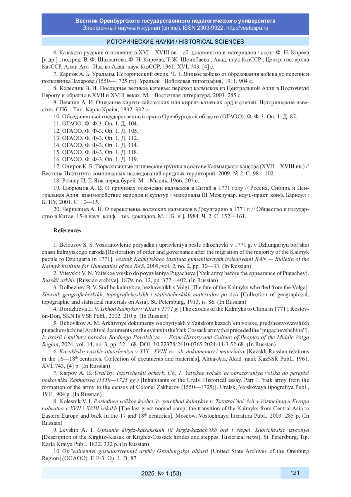 1. Белоусов С. С. Восстановление порядка и управления после откочевки в 1771 г. в Джунгарию большей части калмыцкого народа // Вестник Калмыцкого института гуманитарных исследований РАН. 2009. Т. 2, № 2. С. 30-33. EDN: NDYXCJ