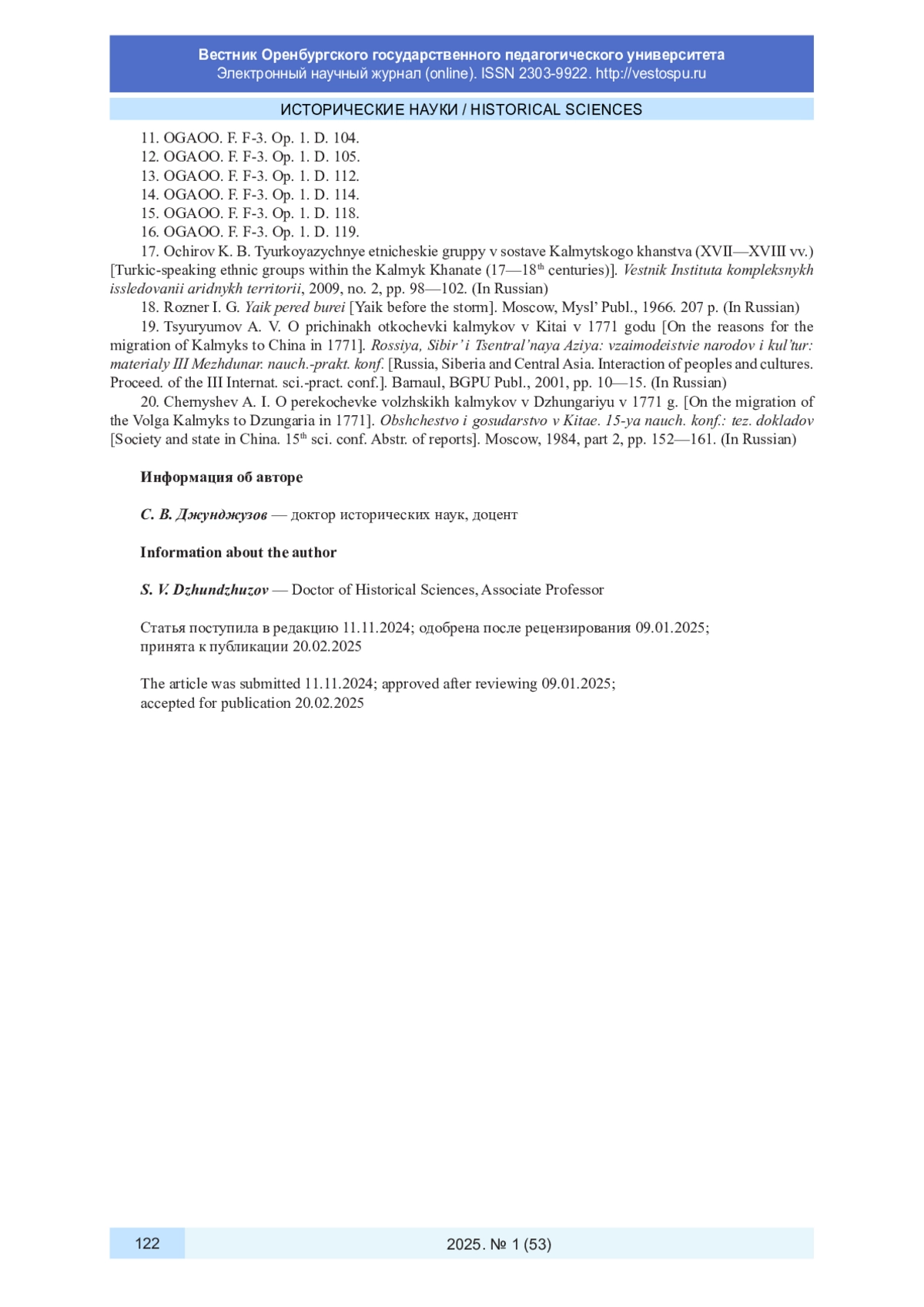 19. Цюрюмов А. В. О причинах откочевки калмыков в Китай в 1771 году // Россия, Сибирь и Центральная Азия: взаимодействие народов и культур: материалы III Междунар. науч.-практ. конф. Барнаул: БГПУ, 2001. С. 10-15. EDN: WXUSIX