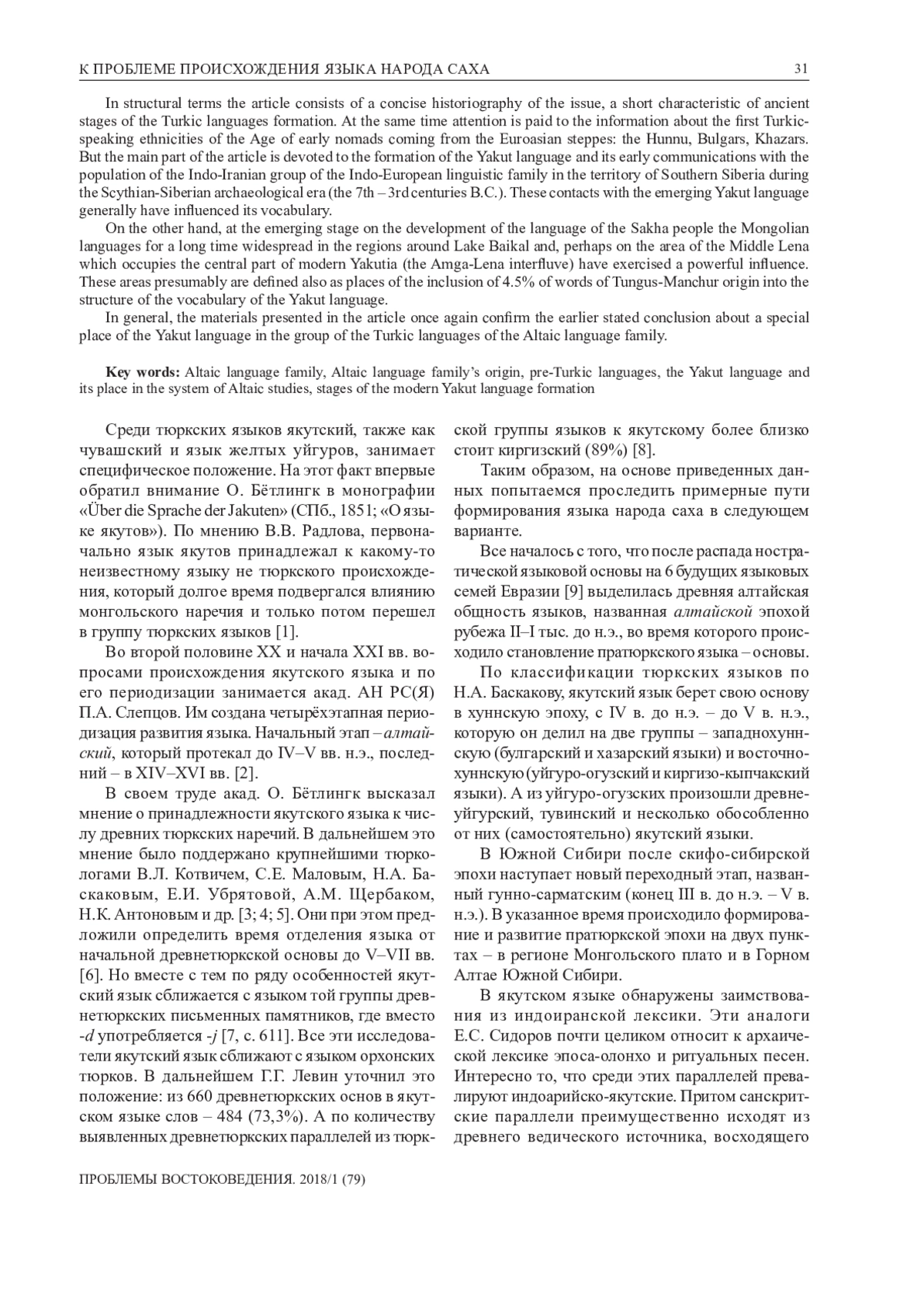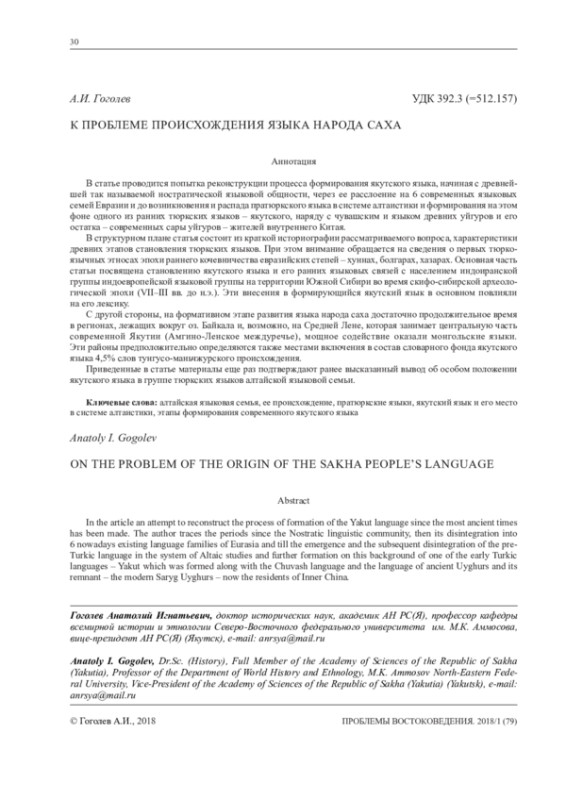 В статье проводится попытка реконструкции процесса формирования якутского языка, начиная с древнейшей так называемой ностратической языковой общности, через ее расслоение на 6 современных языковых семей Евразии и до возникновения и распада пратюркского языка в системе алтаистики и формирования на этом фоне одного из ранних тюркских языков – якутского, наряду с чувашским и языком древних уйгуров и его остатка – современных сары уйгуров – жителей внутреннего Китая. В структурном плане статья состоит из краткой историографии рассматриваемого вопроса, характеристики древних этапов становления тюркских языков. При этом внимание обращается на сведения о первых тюркоязычных этносах эпохи раннего кочевничества евразийских степей – хуннах, болгарах, хазарах. Основная часть статьи посвящена становлению якутского языка и его ранних языковых связей с населением индоиранской группы индоевропейской языковой группы на территории Южной Сибири во время скифо-сибирской археологической эпохи (VII–III вв. до н. э.). Эти внесения в формирующийся якутский язык в основном повлияли на его лексику. С другой стороны, на формативном этапе развития языка народа саха достаточно продолжительное время в регионах, лежащих вокруг оз. Байкала и, возможно, на Средней Лене, которая занимает центральную часть современной Якутии (Амгино-Ленское междуречье), мощное содействие оказали монгольские языки. Эти районы предположительно определяются также местами включения в состав словарного фонда якутского языка 4,5% слов тунгусо-маньчжурского происхождения. Приведенные в статье материалы еще раз подтверждают ранее высказанный вывод об особом положении якутского языка в группе тюркских языков алтайской языковой семьи