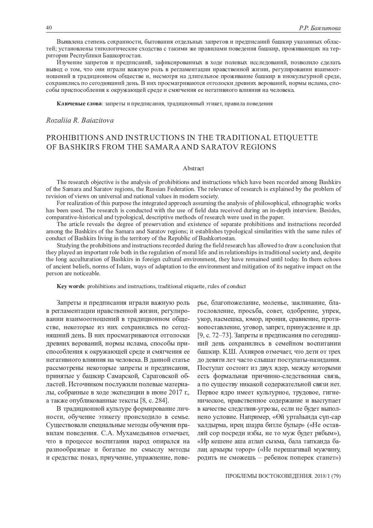 Целью исследования является анализ запретов и предписаний, записанных у башкир Самарской и Саратовской областей Российской Федерации. Актуальность исследования обусловлена проблемой пересмотра взглядов на общечеловеческие и национальные ценностные ориентиры в современном обществе. Автором был использован комплексный подход, предполагающий анализ философских, этнографических работ. Исследование проведено с использованием полевых материалов, полученных в ходе глубинного интервью. Кроме того, в работе использовались сравнительно-исторический и типологический, описательный методы исследования Выявлена степень сохранности, бытования отдельных запретов и предписаний башкир указанных областей; установлены типологические сходства с такими же правилами поведения башкир, проживающих на территории Республики Башкортостан. Изучение запретов и предписаний, зафиксированных в ходе полевых исследований, позволило сделать вывод о том, что они играли важную роль в регламентации нравственной жизни, регулировании взаимоотношений в традиционном обществе и, несмотря на длительное проживание башкир в инокультурной среде, сохранились по сегодняшний день. В них просматриваются отголоски древних верований, нормы ислама, способы приспособления к окружающей среде и смягчения ее негативного влияния на человека