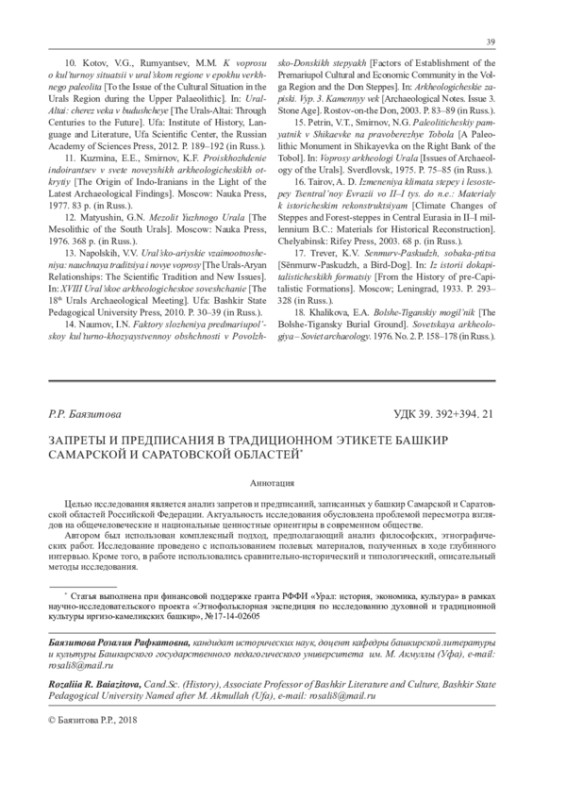 Запреты и предписания играли важную роль в регламентации нравственной жизни, регулировании взаимоотношений в традиционном обществе, некоторые из них сохранились по сегодняшний день. В них просматриваются отголоски древних верований, нормы ислама, способы приспособления к окружающей среде и смягчения ее негативного влияния на человека. В данной статье рассмотрены некоторые запреты и предписания, принятые у башкир Самарской, Саратовской областей. Источником послужили полевые материалы, собранные в ходе экспедиции в июне 2017 г., а также опубликованные тексты
