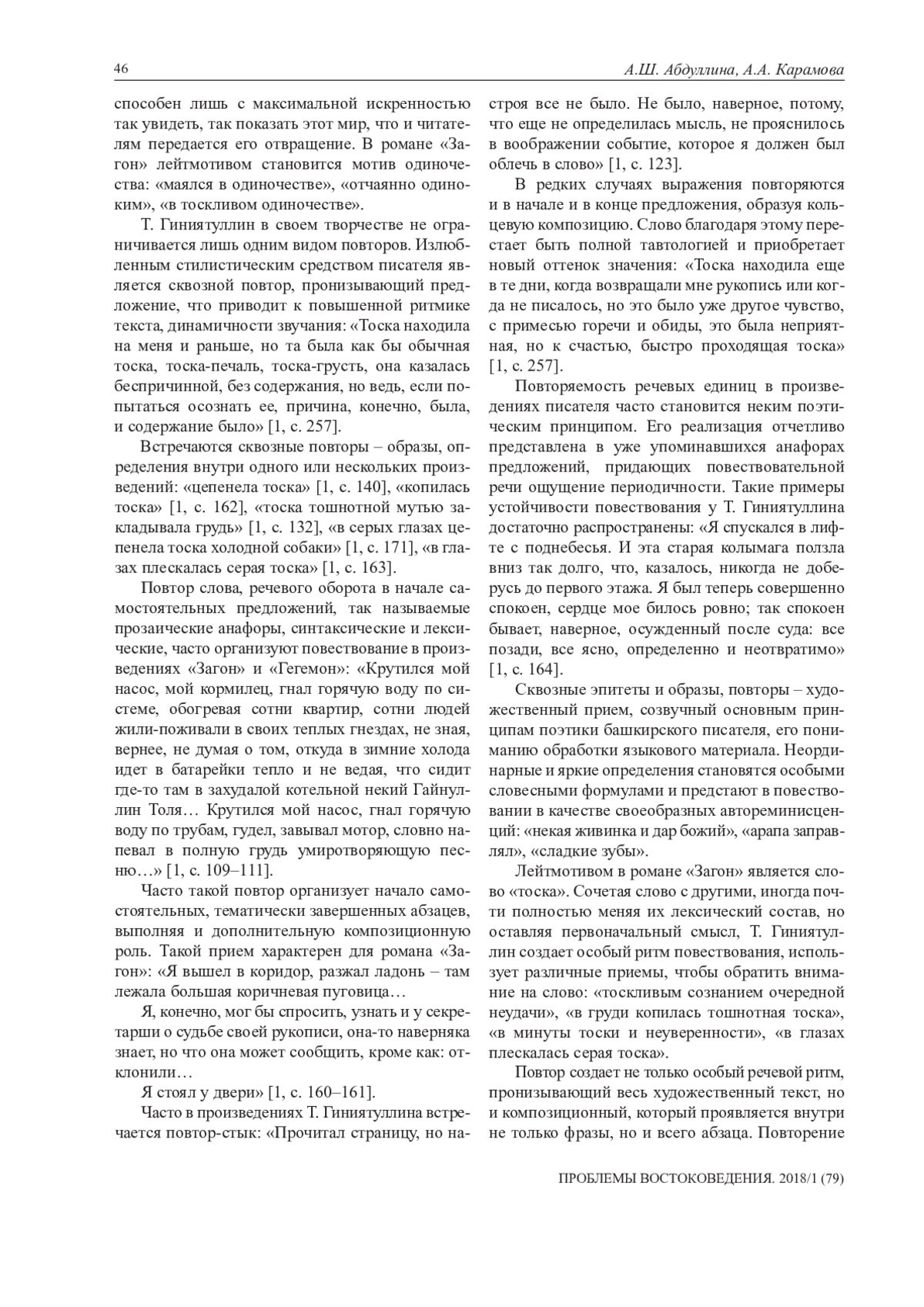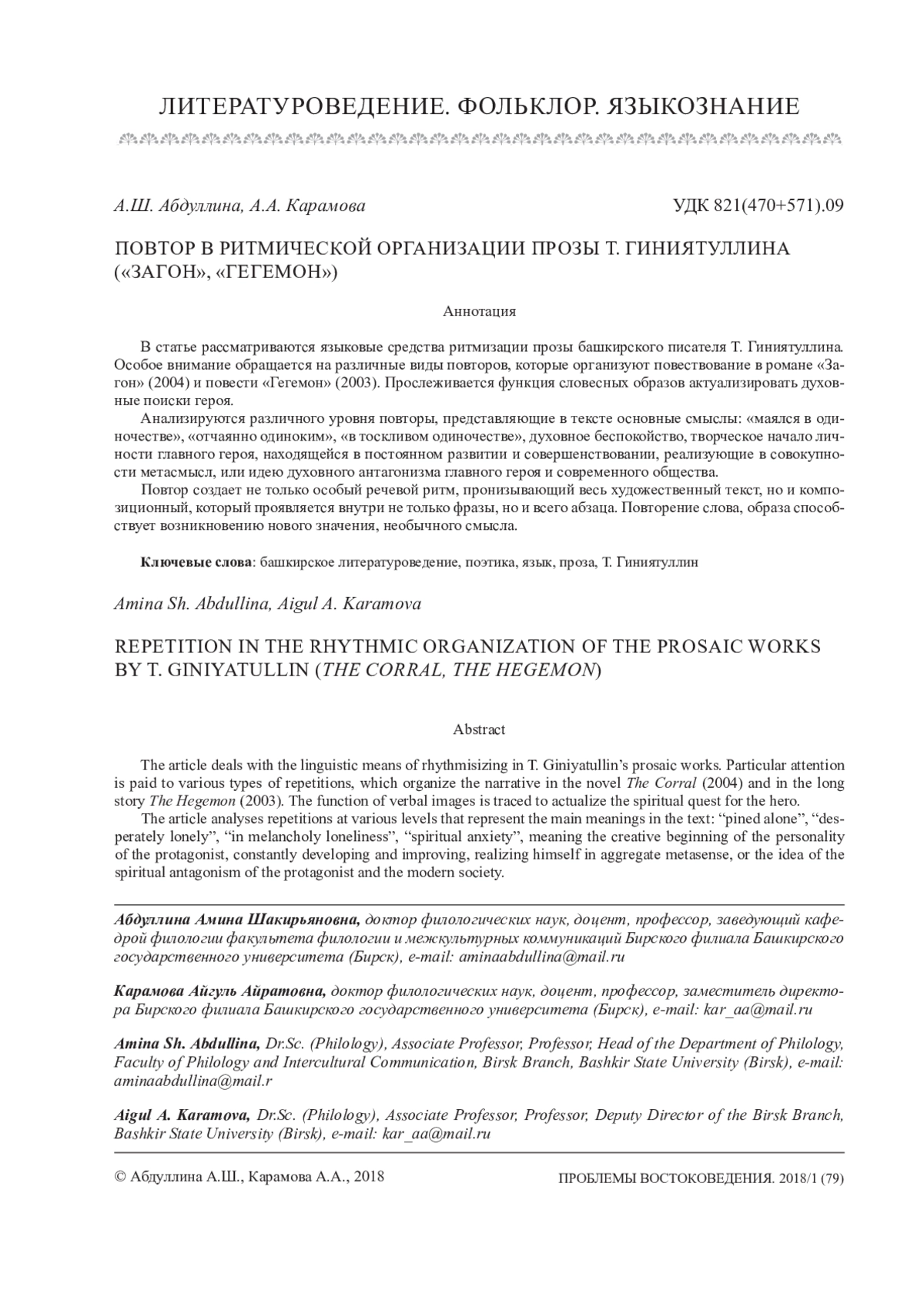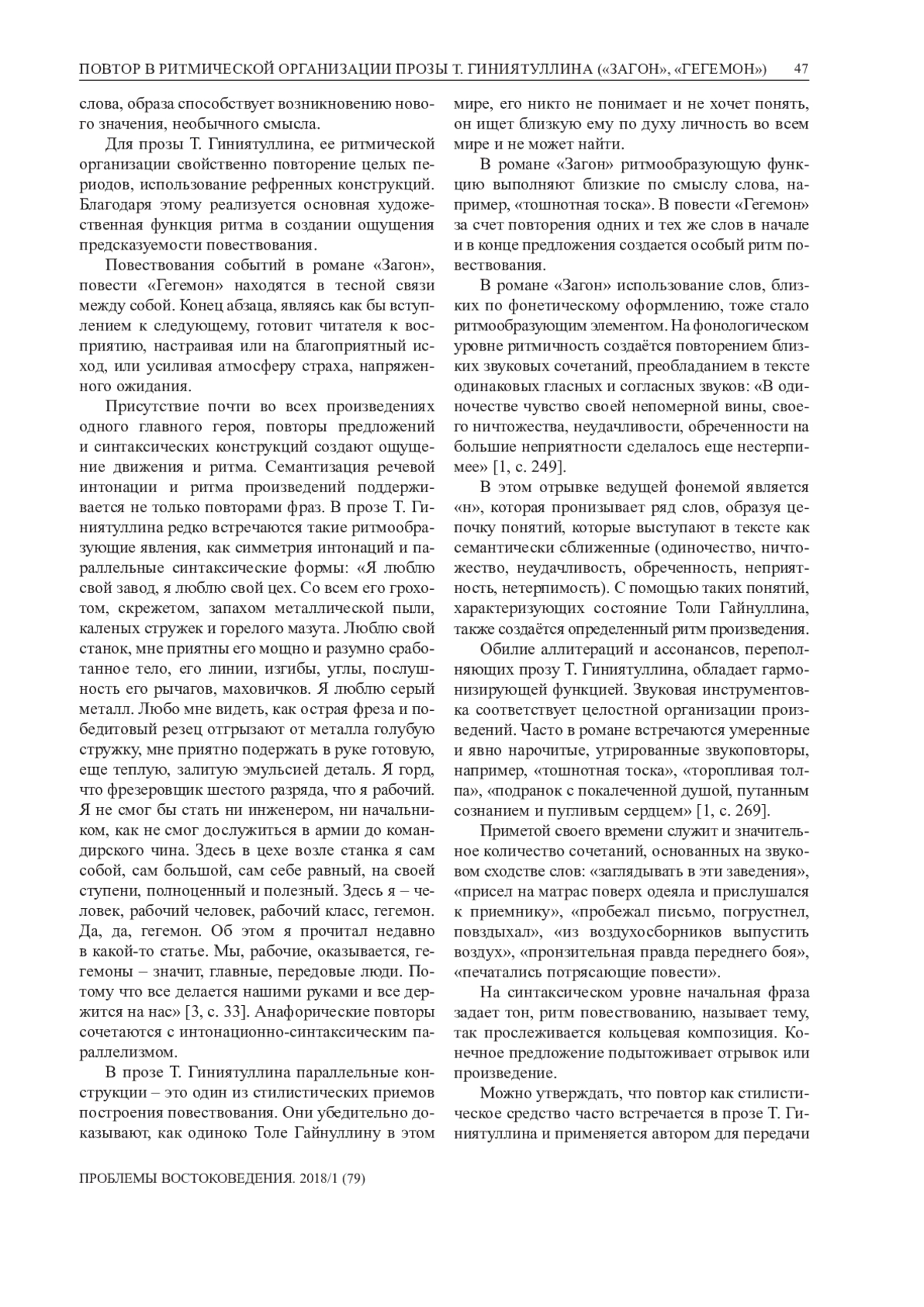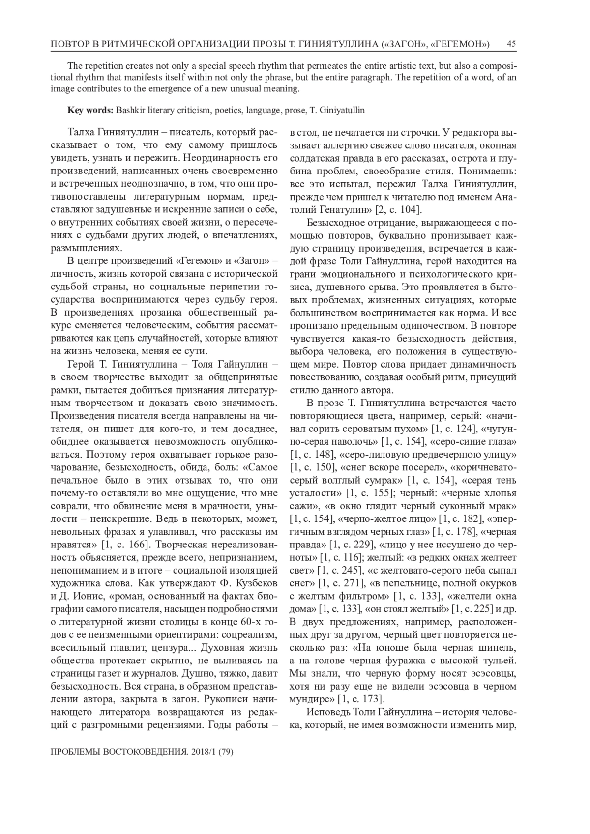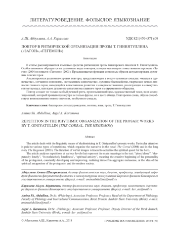 В статье рассматриваются языковые средства ритмизации прозы башкирского писателя Т. Гиниятуллина. Особое внимание обращается на различные виды повторов, которые организуют повествование в романе «Загон» (2004) и повести «Гегемон» (2003). Прослеживается функция словесных образов актуализировать духовные поиски героя. Анализируются различного уровня повторы, представляющие в тексте основные смыслы: «маялся в одиночестве», «отчаянно одиноким», «в тоскливом одиночестве», духовное беспокойство, творческое начало личности главного героя, находящейся в постоянном развитии и совершенствовании, реализующие в совокупности метасмысл, или идею духовного антагонизма главного героя и современного общества. Повтор создает не только особый речевой ритм, пронизывающий весь художественный текст, но и композиционный, который проявляется внутри не только фразы, но и всего абзаца. Повторение слова, образа способствует возникновению нового значения, необычного смысла