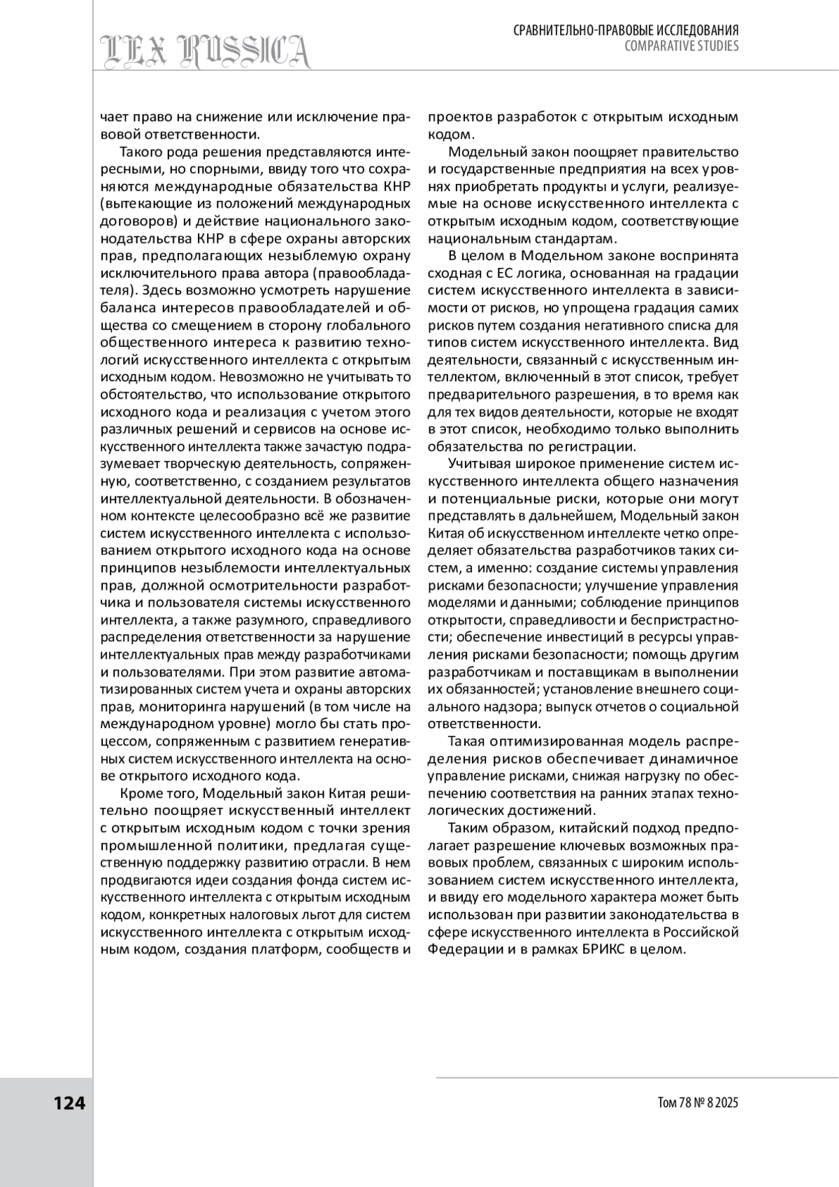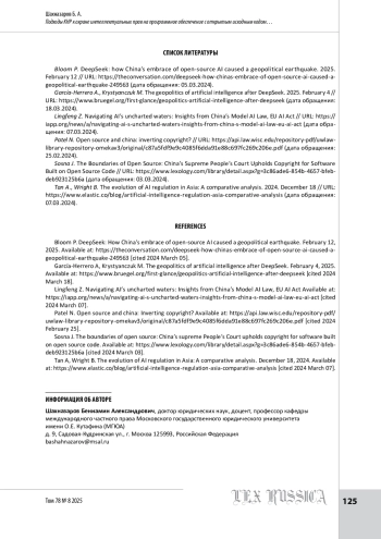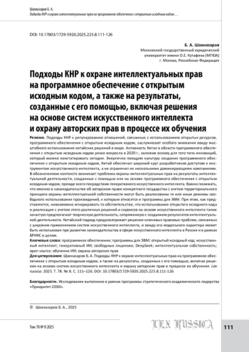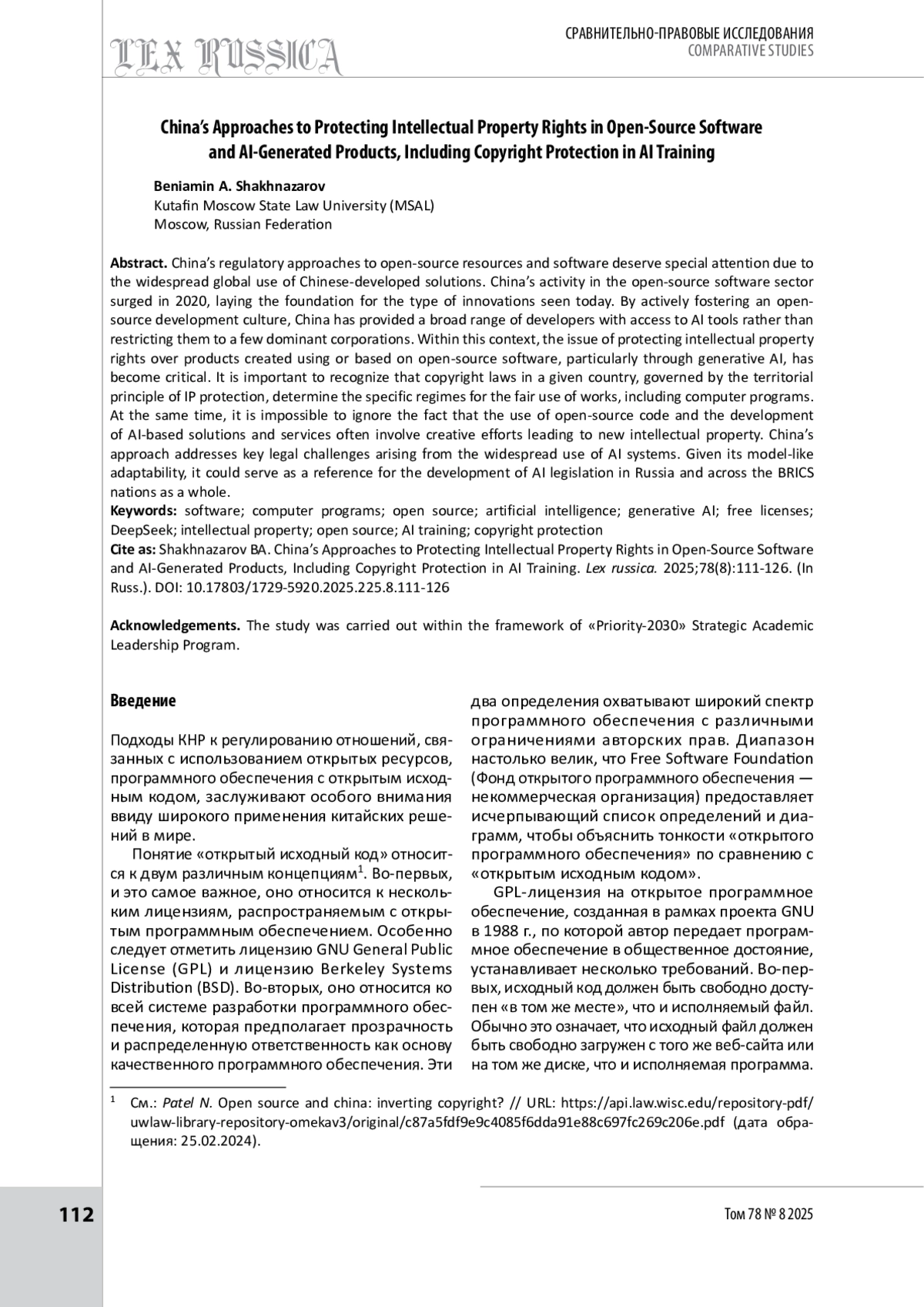 Подходы КНР к регулированию отношений, связанных с использованием открытых ресурсов, программного обеспечения с открытым исходным кодом, заслуживают особого внимания ввиду масштабного использования китайских решений в мире. Активность Китая в области программного обеспечения с открытым исходным кодом резко возросла в 2020 г., заложив основу для того типа инноваций, который можно констатировать сегодня. Энергично поощряя культуру создания программного обеспечения с открытым исходным кодом, Китай обеспечил широкий круг разработчиков доступом к инструментам искусственного интеллекта, а не ограничил их несколькими доминирующими компаниями. В обозначенном контексте возникает проблема охраны интеллектуальных прав на результаты интеллектуальной деятельности, созданные с помощью или на основе программного обеспечения с открытым исходным кодом, прежде всего посредством генеративного искусственного интеллекта. Важно понимать, что именно в законодательстве об авторском праве конкретного государства с учетом территориального принципа охраны интеллектуальной собственности могут быть реализованы те или иные режимы свободного использования произведений, к которым относятся и программы для ЭВМ. При этом, как представляется, невозможно игнорировать то обстоятельство, что использование открытого исходного кода и реализация с учетом этого различных решений и сервисов на основе искусственного интеллекта также зачастую предполагают творческую деятельность, сопряженную с созданием результатов интеллектуальной деятельности. Китайский подход предусматривает решение ключевых правовых проблем, связанных с широким применением систем искусственного интеллекта, и ввиду его модельного характера может быть использован при развитии законодательства в сфере искусственного интеллекта в России и в рамках БРИКС в целом.