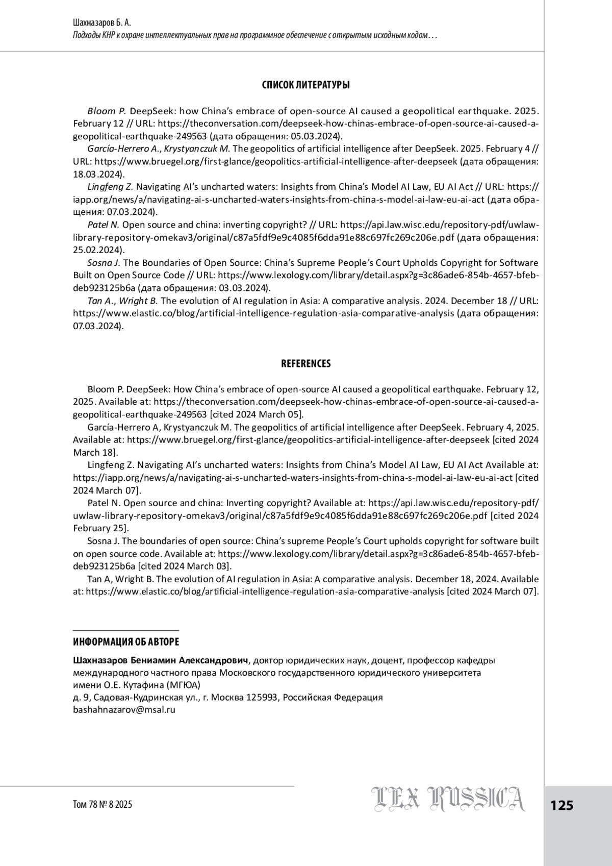 4. Patel N. Open source and china: inverting copyright? // URL: https://api.law.wisc.edu/repository-pdf/uwlaw-library-repository-omekav3/original/c87a5fdf9e9c4085f6dda91e88c697fc269c206e.pdf (дата обращения: 25.02.2024).