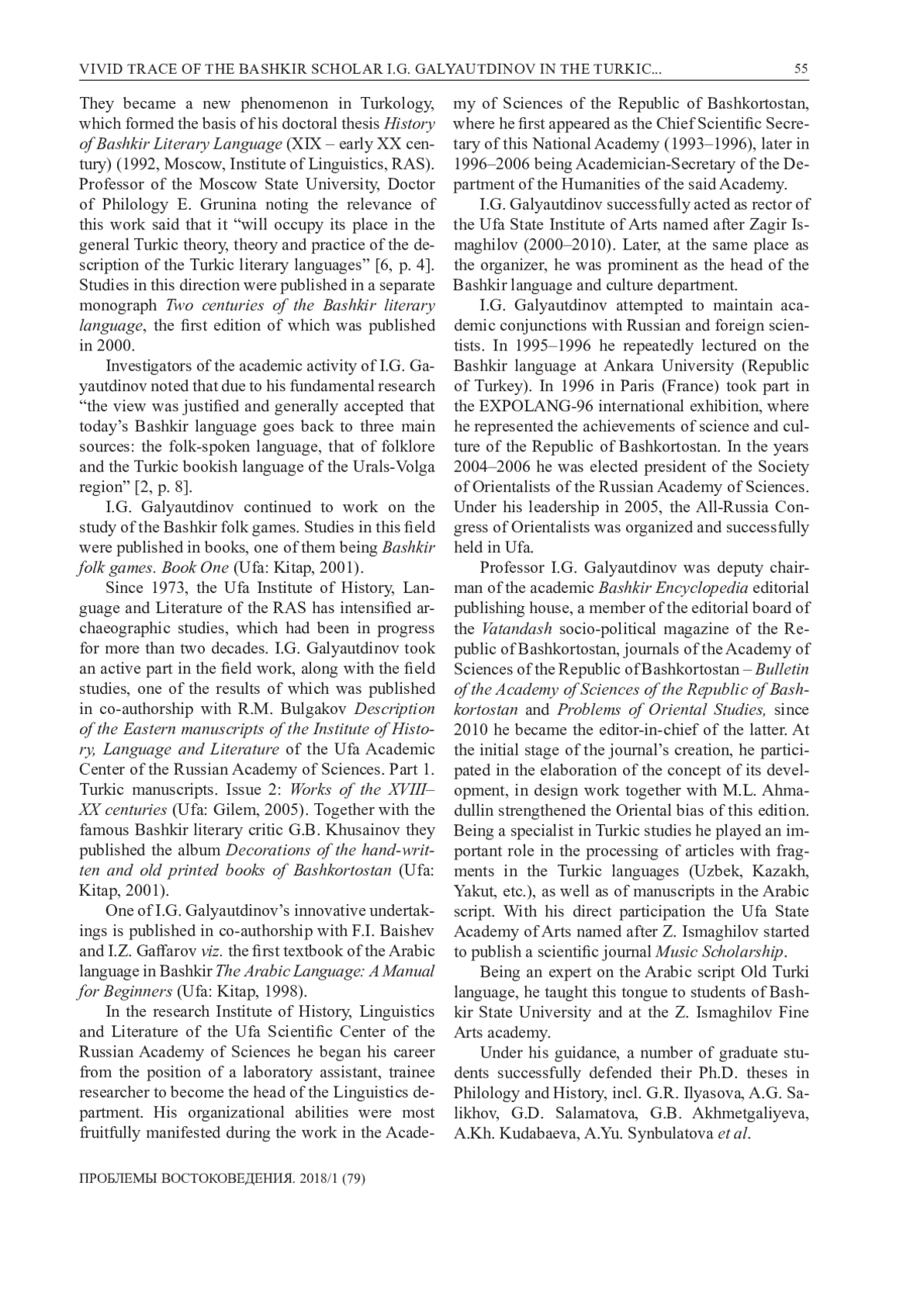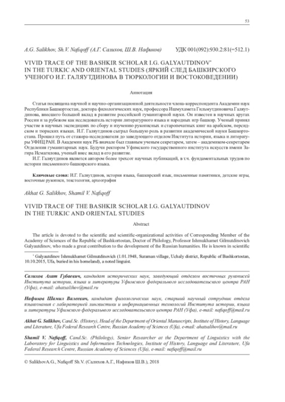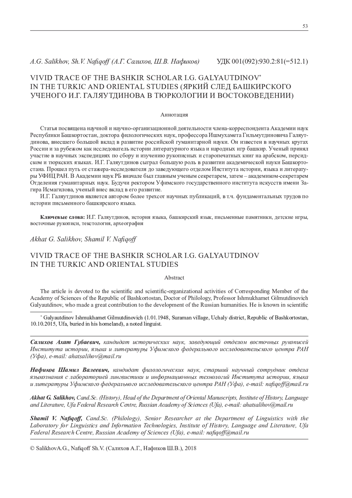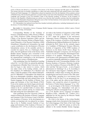 Corresponding Member of the Academy of Sciences of Bashkortostan (1995), Doctor of Philology (1992), Professor (1994), Honored Worker of Culture of the Russian Federation (2005) and the BASSR (1986), Honorary Worker of Higher Professional Education of the Russian Federation (2008) Ishmukhamet Gilmutdinovich Galyautdinov has made a great contribution to the development of Russian humanitarian science. In his scientific activity we consider two aspects: first, as a Turkologist, Orientalist, who left significant works in the history of the Bashkir literary language and a researcher of the Bashkir folk games; secondly, it is necessary to note his organizational contribution to the development of the academic science of Bashkortostan