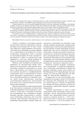 В данной статье рассматриваются в единстве и взаимосвязи три аспекта назывных предложений: семантический, структурный и функциональный. В качестве основного фактического исследования послужили образцы башкирской разговорной речи. Назывные предложения используются в разговорной речи, придавая тексту лаконичность, эмоциональность, краткость, динамику, дают возможность избежать излишнего повторения местоимений. Они играют ведущую роль в описании, т. к. обеспечивают выразительность и наглядность изображения. В них явление, процесс, события, картина, предмет обычно только называются. В башкирской разговорной речи рассматриваются следующие виды назывных предложений: назывное описательное, назывное со значением эмоции, назывное со значением пожелания, назывное со значением брани. Они являются формой, служащей для экономного и экспресcивного выражения утверждения о существовании предметов, явлений, действий, признаков. В данной статье термин «разговорная речь» понимается как речь персонажей художественной литературы, в первую очередь, драматических произведений. Привлекались также конструкции монологической речи (из авторских повествований, диалектной речи, записей живой речи). Мы считаем, что главные синтаксические особенности разговорной речи отразились именно в художественной литературе