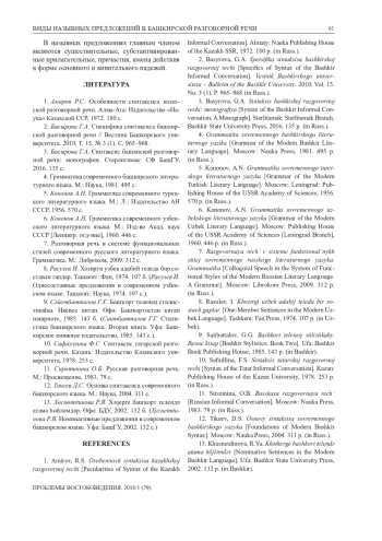 2. Басырова Г.А. Специфика синтаксиса башкирской разговорной речи // Вестник Башкирского университета. 2010. Т. 15. № 3 (1). С. 965-968. EDN: NDDATL