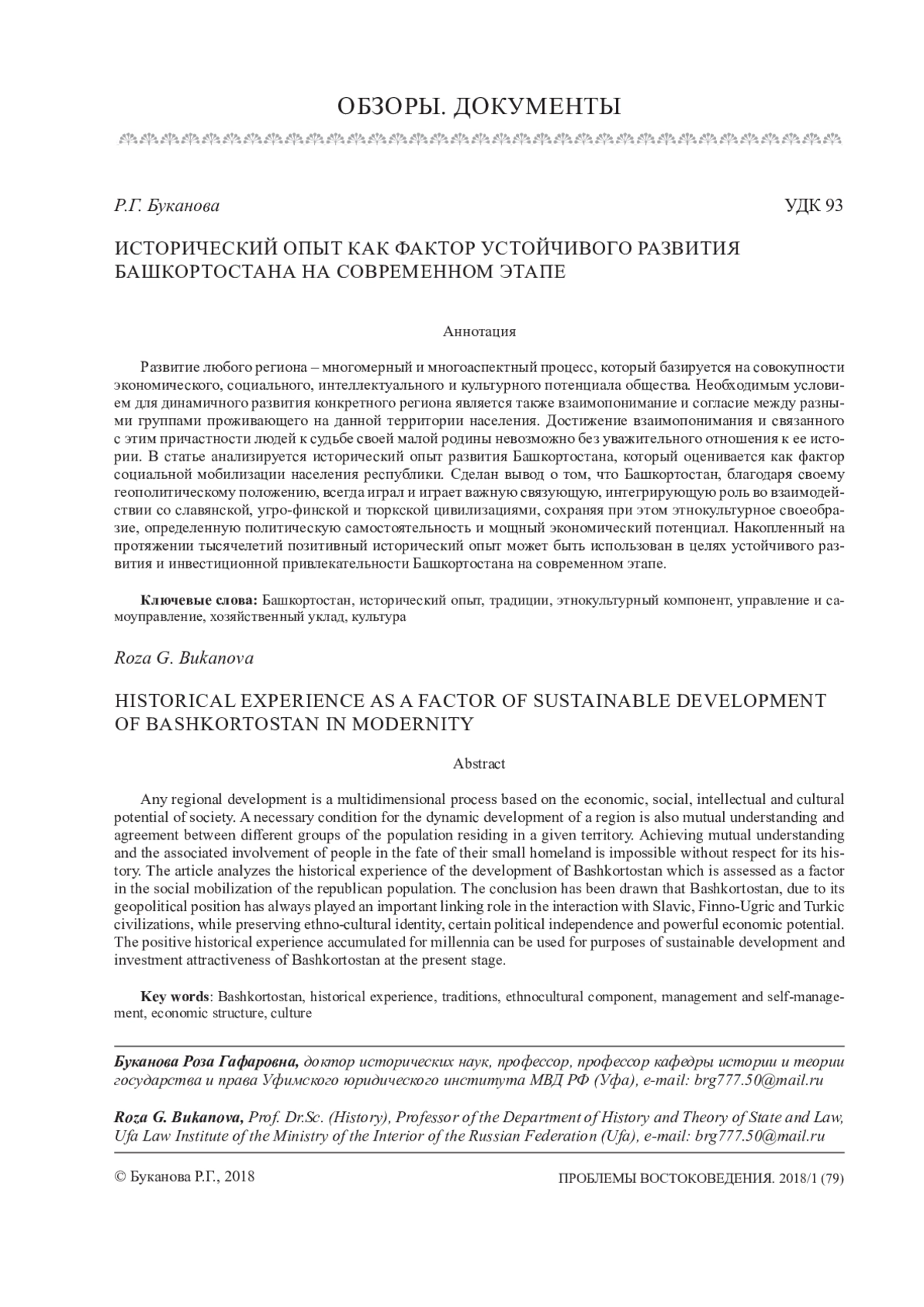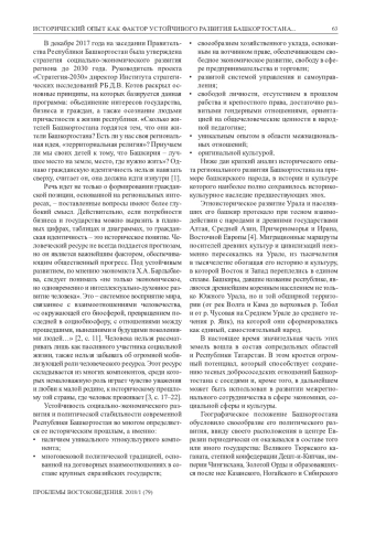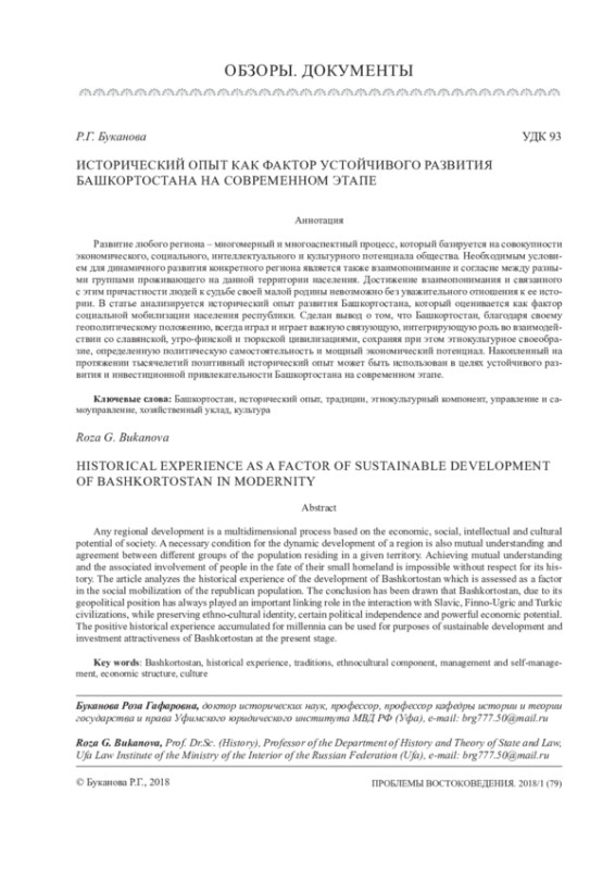 Развитие любого региона – многомерный и многоаспектный процесс, который базируется на совокупности экономического, социального, интеллектуального и культурного потенциала общества. Необходимым условием для динамичного развития конкретного региона является также взаимопонимание и согласие между разными группами проживающего на данной территории населения. Достижение взаимопонимания и связанного с этим причастности людей к судьбе своей малой родины невозможно без уважительного отношения к ее истории. В статье анализируется исторический опыт развития Башкортостана, который оценивается как фактор социальной мобилизации населения республики. Сделан вывод о том, что Башкортостан, благодаря своему геополитическому положению, всегда играл и играет важную связующую, интегрирующую роль во взаимодействии со славянской, угро-финской и тюркской цивилизациями, сохраняя при этом этнокультурное своеобразие, определенную политическую самостоятельность и мощный экономический потенциал. Накопленный на протяжении тысячелетий позитивный исторический опыт может быть использован в целях устойчивого развития и инвестиционной привлекательности Башкортостана на современном этапе