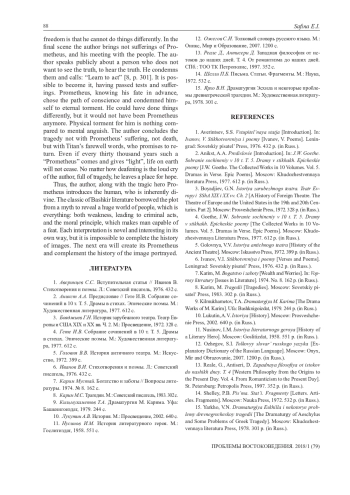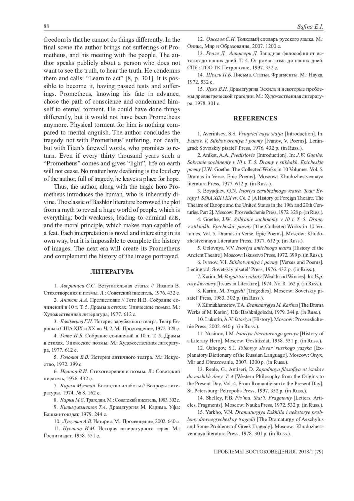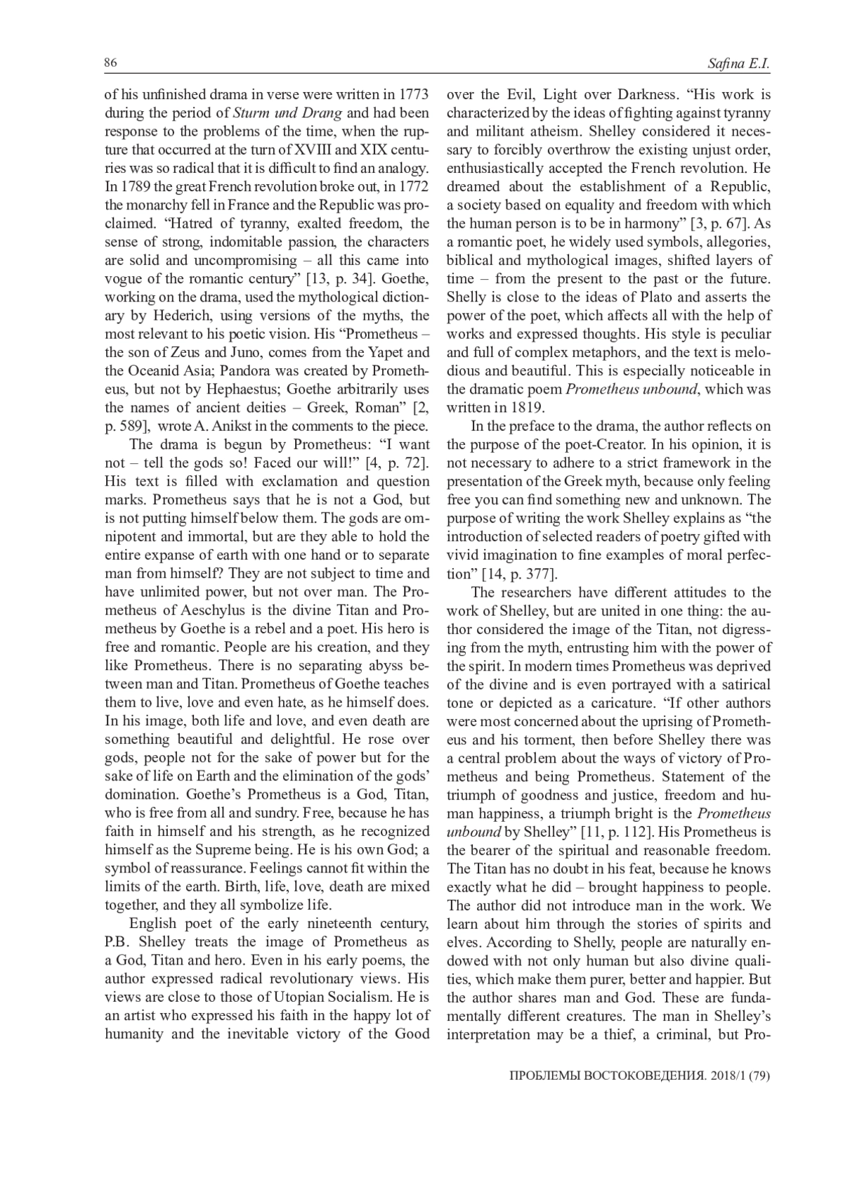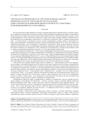 In world mythology, Prometheus is a God, a hero who committed a heroic act for the sake of people. In the interpretation of the authors of different eras, the image is modified and acquires completely different meanings. Starting from antiquity and approaching the XX century, it is not only a Titan, but an image that absorbs new symbols. Aeschylus’ tragedy Prometheus bound (V century B. C.), Johann Wolfgang Goethe’s unfinished drama Prome theus (1773), Piercy Bysshe Shelley in the dramatic poem Prometheus unbound (1819), Vyacheslav Ivanov in the tragedy Prometheus (1919) and Mus tai Karim in his work Do not drop the fire, Prometheus! (1976) consider the image of Prometheus not only as myths but also as the bearer of tragic consciousness