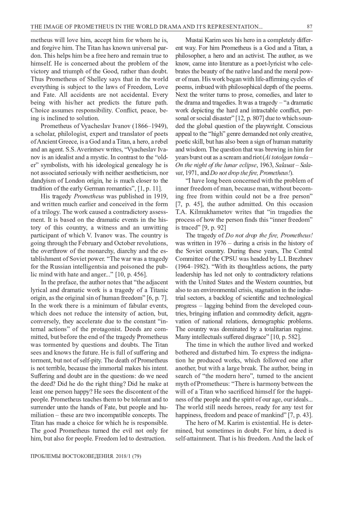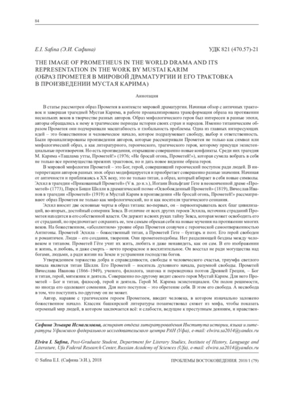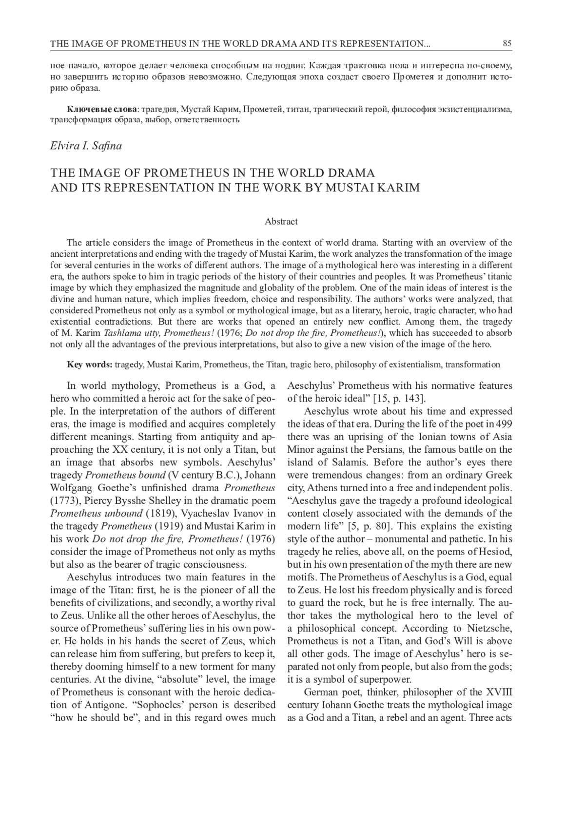 В статье рассмотрен образ Прометея в контексте мировой драматургии. Начиная обзор с античных трактовок и завершая трагедией Мустая Карима, в работе проанализирована трансформация образа на протяжении нескольких веков в творчестве разных авторов. Образ мифологического героя был интересен в разные эпохи, авторы обращались к нему в трагические периоды истории своих стран и народов. Именно титаническим образом Прометея они подчеркивали масштабность и глобальность проблемы. Одна из главных интересующих идей – это божественное и человеческое начало, которое подразумевает свободу, выбор и ответственность. Были проанализированы произведения авторов, которые рассматривали Прометея не только как символ или мифологический образ, а как литературного, героического, трагического героя, которому присущи экзистенциальные противоречия. Но есть произведения, открывшие совершенно новые конфликты. Среди них трагедия М. Карима «Ташлама утты, Прометей!» (1976; «Не бросай огонь, Прометей!»), которая сумела вобрать в себя не только все преимущества прежних трактовок, но и дать новое видение образа героя. В мировой мифологии Прометей – это Бог, герой, совершивший героический поступок ради людей. В интерпретации авторов разных эпох образ модифицируется и приобретает совершенно разные значения. Начиная от античности и приближаясь к XX веку, это не только титан, а образ, который вбирает в себя новые символы. Эсхил в трагедии «Прикованный Прометей» (V в. до н. э.), Иоганн Вольфганг Гете в неоконченной драме «Прометей» (1773), Пирси Биши Шелли в драматической поэме «Освобожденный Прометей» (1819), Вячеслав Иванов в трагедии «Прометей» (1919) и Мустай Карим в произведении «Не бросай огонь, Прометей!» рассматривают образ Прометея не только как мифологический, но и как носителя трагического сознания. Эсхил вносит две основные черты в образ титана: во-первых, он – первооткрыватель всех благ цивилизаций, во-вторых, достойный соперник Зевса. В отличие от всех других героев Эсхила, источник страданий Прометея находится в его собственной власти. Он держит в своих руках тайну Зевса, которая может освободить его от страданий, но предпочитает сохранить ее, тем самым обрекая себя на новые мучения на протяжении многих веков. На божественном, «абсолютном» уровне образ Прометея созвучен с героической самоотверженностью Антигоны. Прометей Эсхила – божественный титан, а Прометей Гете – бунтарь и поэт. Его герой свободен и романтичен. Люди – его создания, творения. Они прометееподобны. Нет разделяющей бездны между человеком и титаном. Прометей Гёте учит их жить, любить и даже ненавидеть, как он сам. В его изображении и жизнь, и любовь, и даже смерть – нечто прекрасное и восхитительное. Он восстал не ради могущества над богами, людьми, а ради жизни на Земле и устранения господства богов. Утверждением торжества добра и справедливости, свободы и человеческого счастья, триумфа светлого начала является титан Шелли. Его Прометей – носитель духовного начала, разумной свободы. Прометей Вячеслава Иванова (1866–1949), ученого, филолога, знатока и переводчика поэтов Древней Греции, – Бог и титан, герой, мятежник и деятель. Совершенно по-другому видит своего героя Мустай Карим. Для него Прометей – Бог и титан, философ, герой и деятель. Герой М. Карима экзистенциален. Он полон решимости, но
